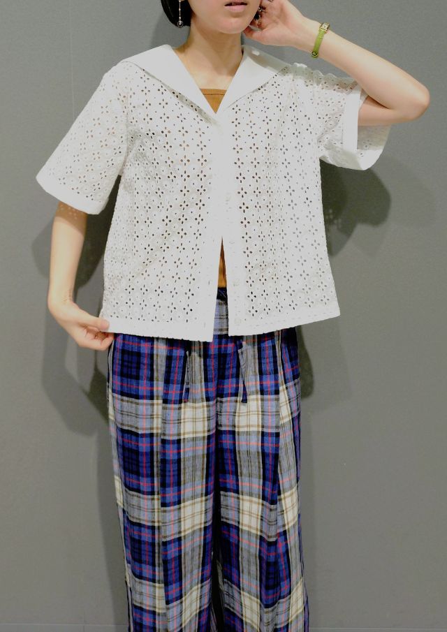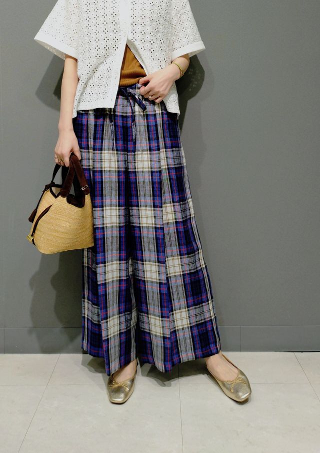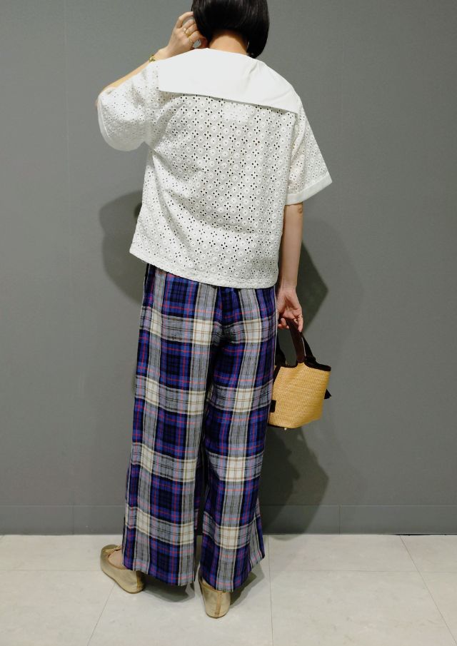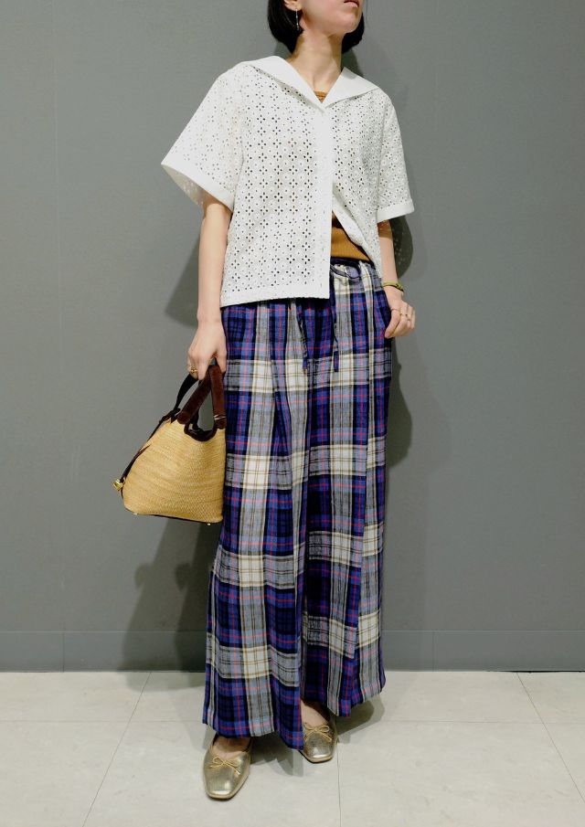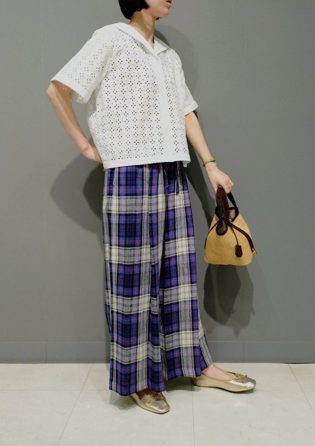 インドコットン×カットワークレースのブラウスと 上質リネンのパンツを合わせて、上品で涼やかなスタイリングに🌟