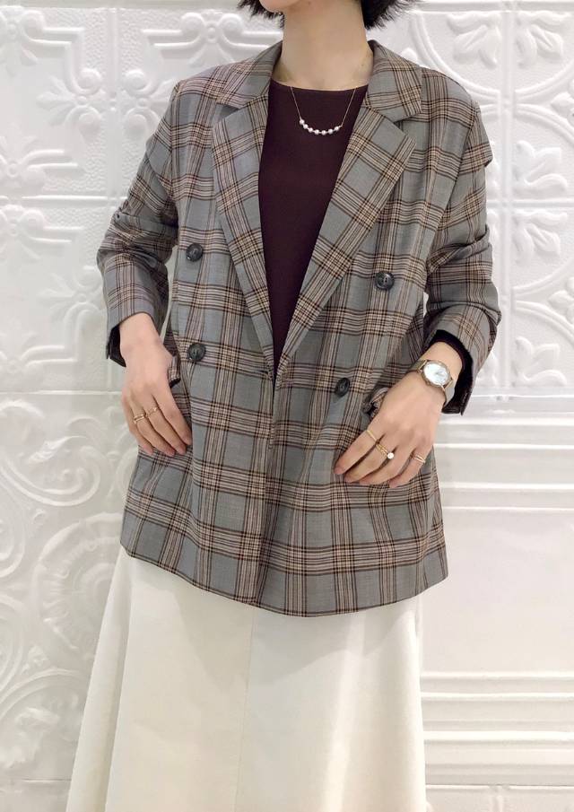 落ち着いたトーンのチェックは馴染みやすく、いつものスタイルに羽織るだけで