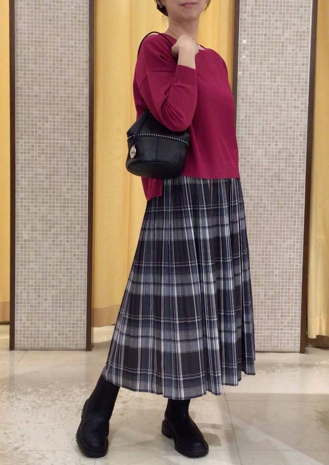 チェックのプリーツスカートは程よい丈感でブーツとの相性も◎