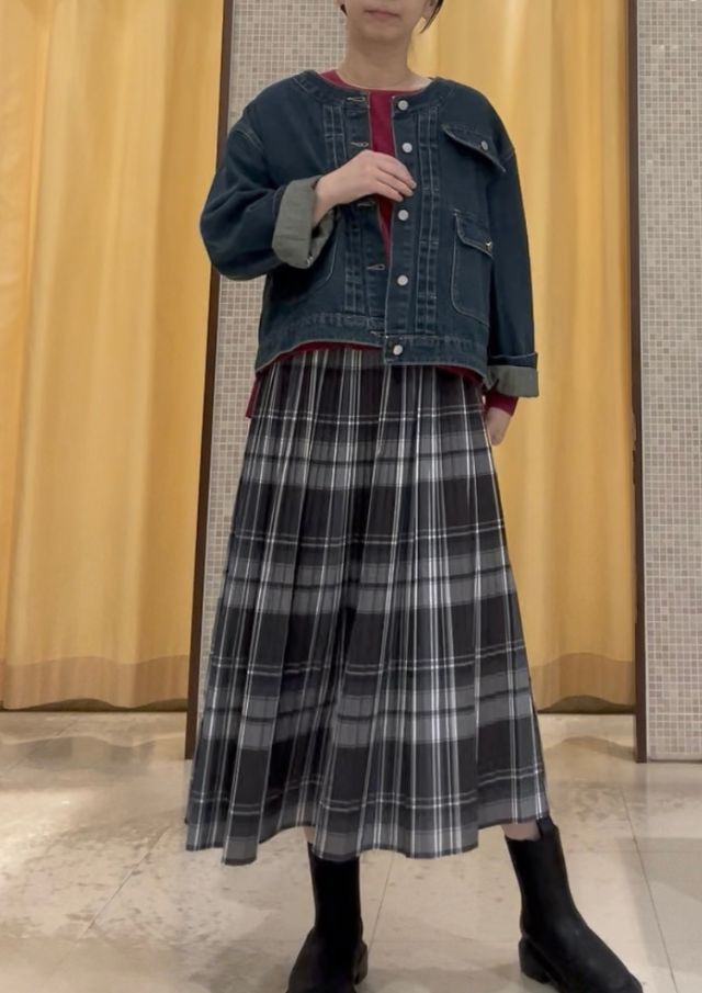 ノーカラーのデニムジャケットと合わせて、秋の一推しコーディネイトの完成です💛