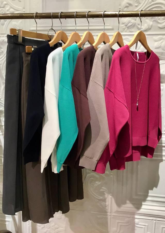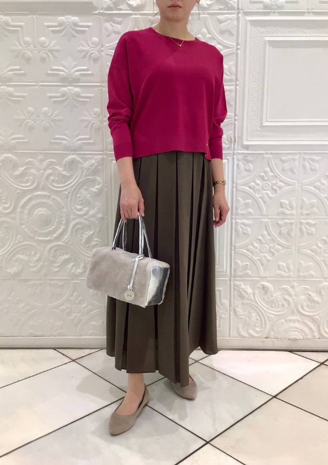 色鮮やかなニットと洗練されたプリーツのスカートが秋らしさを感じさせます。