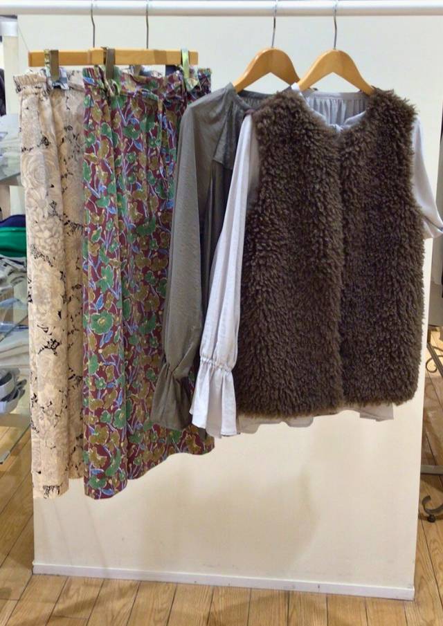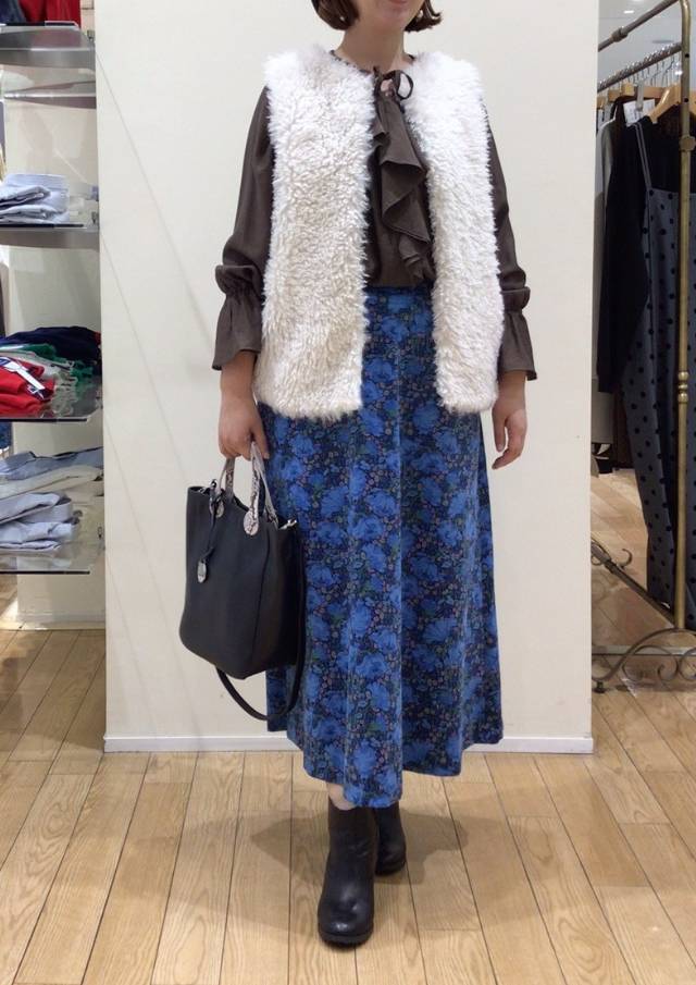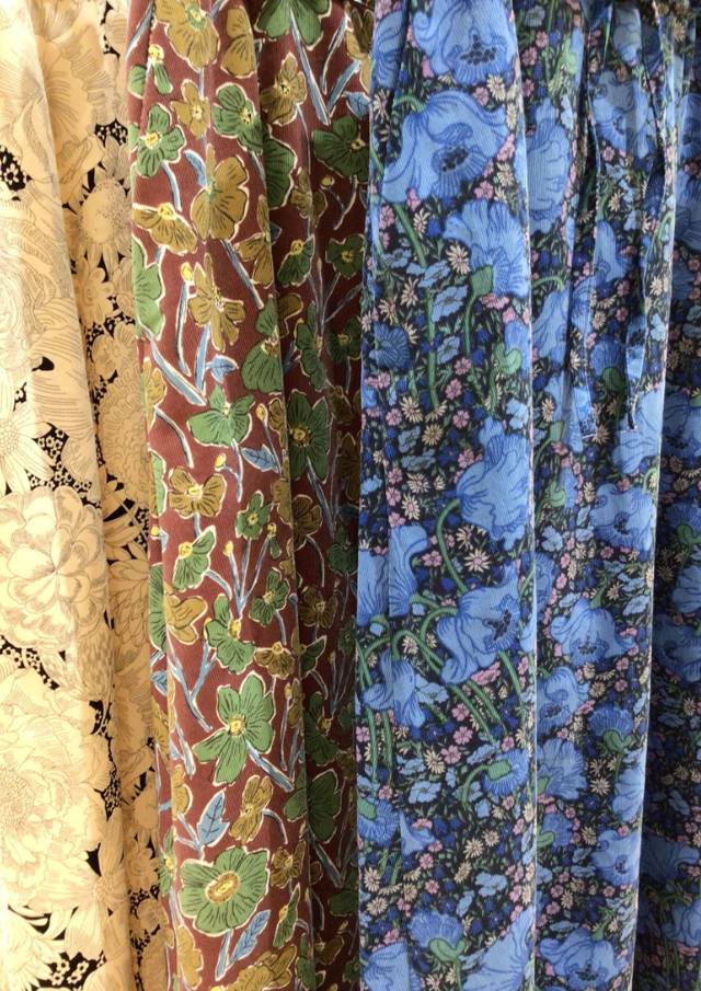 リバティプリントのスカートはコーデュロイ素材で、今から冬もお使いいただけるアイテムです。