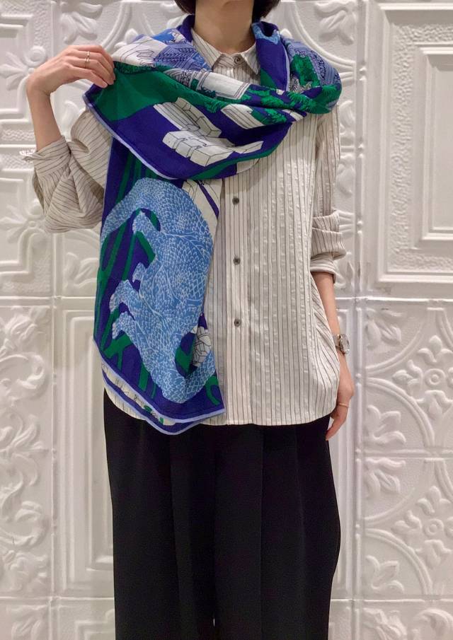 シンプルなスタイリングにイヌイ・エディションズのストールをプラス✨
