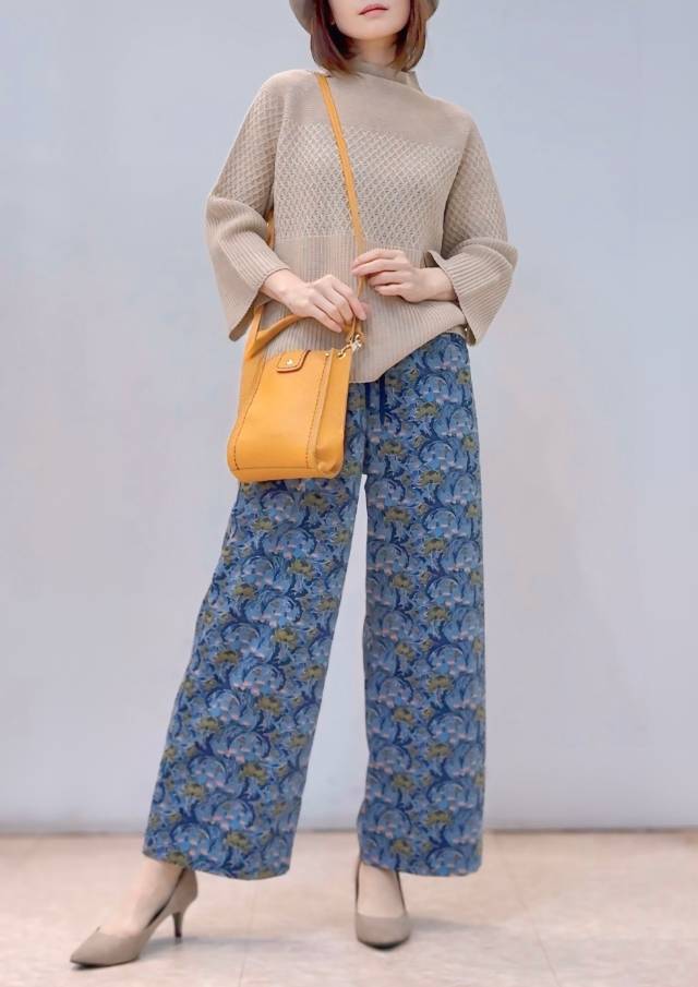 コーデュロイのリバティプリントパンツにベージュの薄手ニット、差し色にイエローのポーチをアクセントに。