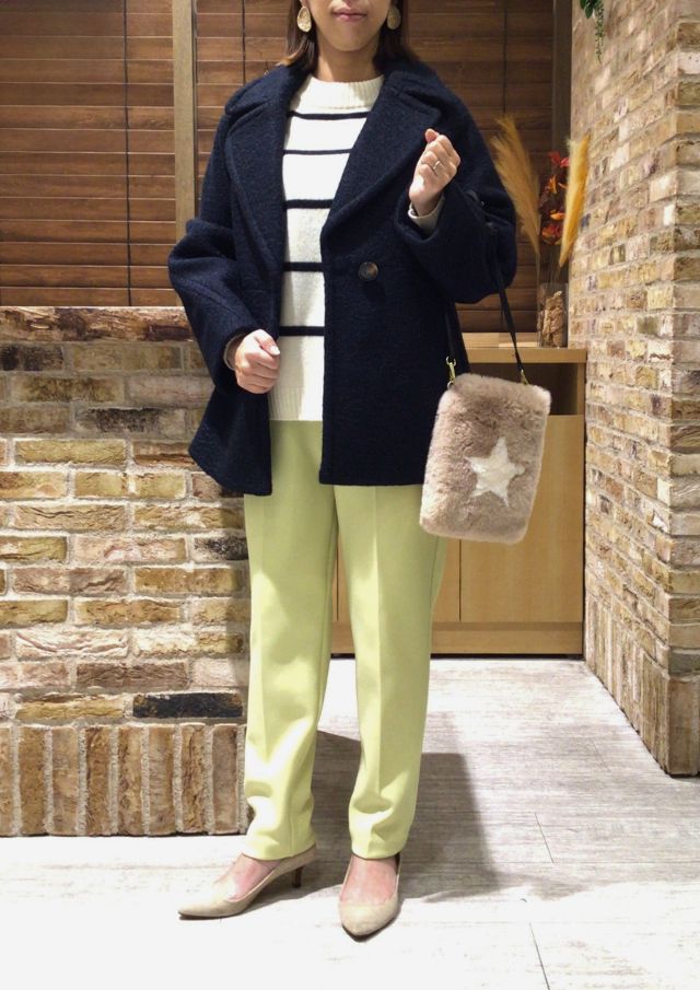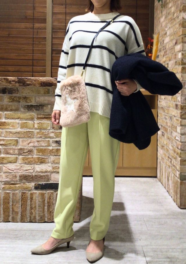 ボーダーニットにパワーカラーのパンツを合わせた、カジュアルコーデが年末年始の帰省や旅行など、冬のお出掛けにおすすめです♪