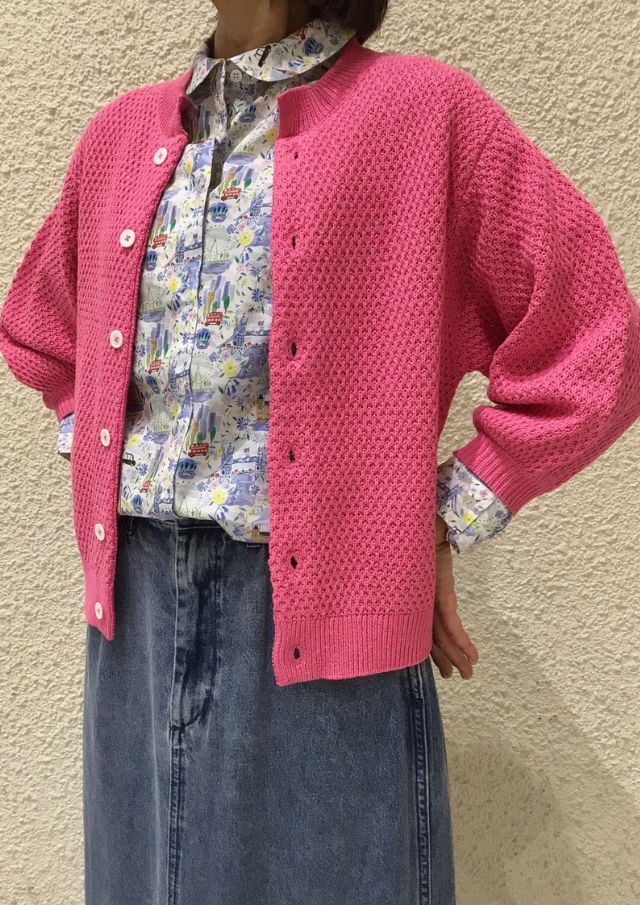 カーディガンは、透かし編みが春らしく、軽やかなスタイリングに仕上がります。