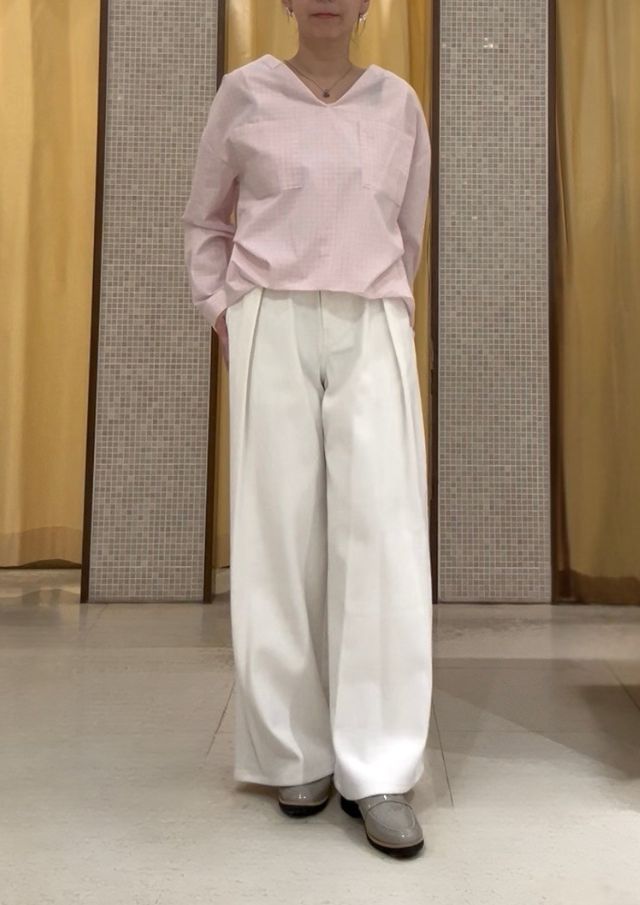 ブラウスは内側のスナップボタンで着丈を短くできるので、ボトムにINしなくてもバランス◯