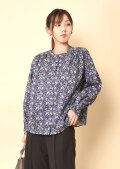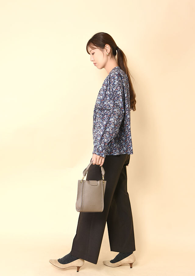 バンドカラーのスッキリとした首元に、前ヨークとバックネックに寄せたギャザーがふんわりと立体感を生み出します。