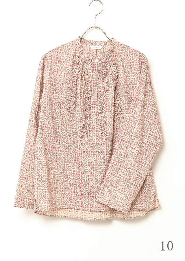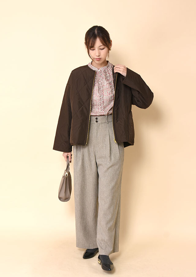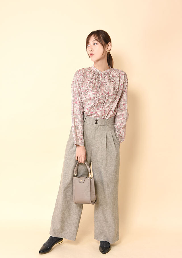 ゆったりとしたワイドパンツやロングスカートと合わせると、ギャザーやフリルのやわらかさが自然に映え、秋らしい落ち着きのある装いに。