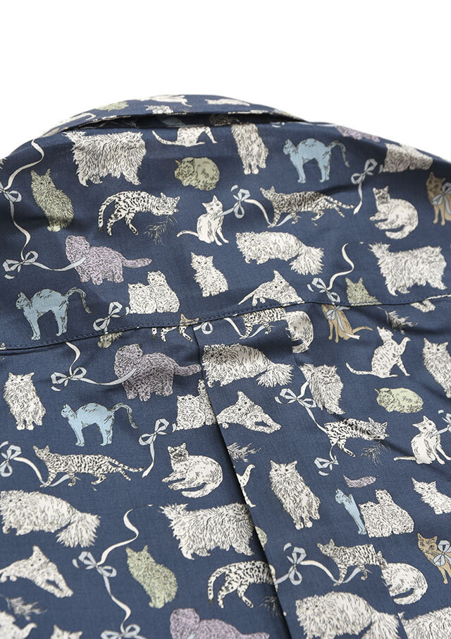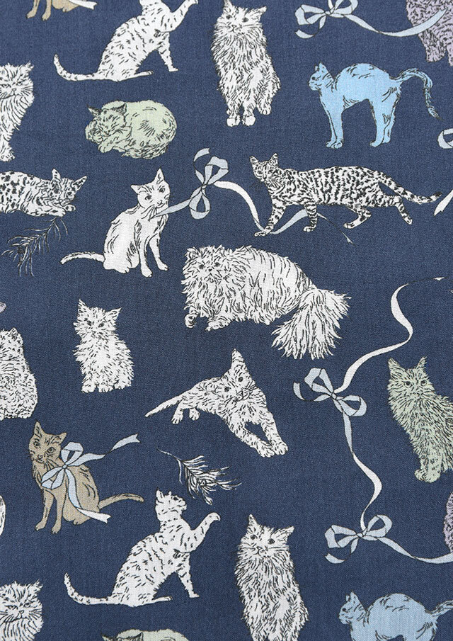 リバティの人気デザイン「ミャオウ(Meow)」から着想を得たこの新たな作品は、日本と英国のリバティスタッフが実際に飼っている猫たちをモチーフにしています。