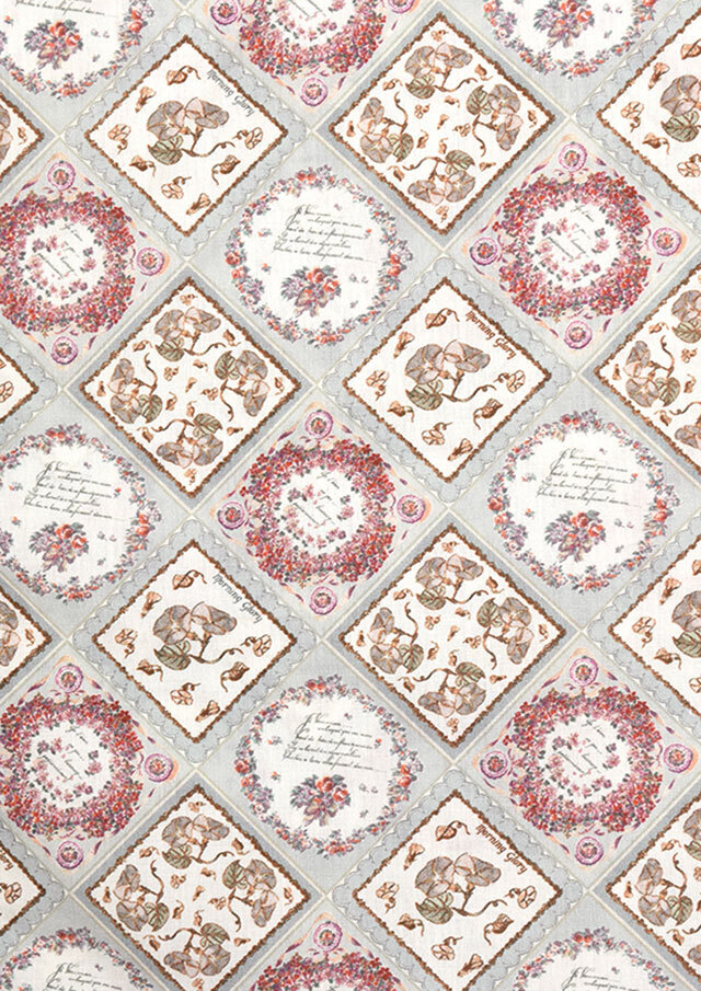1940年代のリバティスカーフデザインを3つ組み合わせ、斜めのパッチワークレイアウトで美しく表現しました。