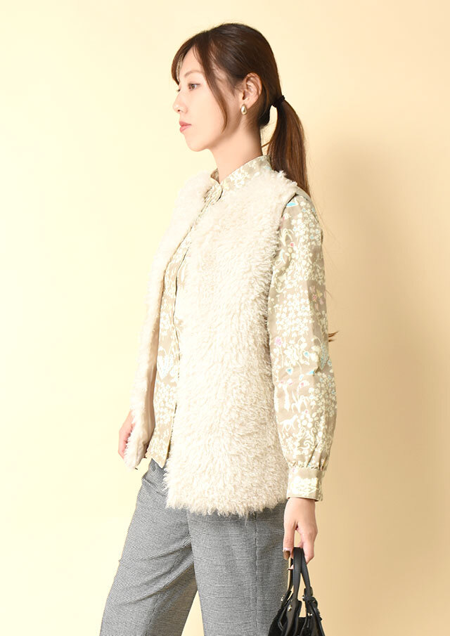 柄の奥行きと、繊細な発色がスタイリング全体に静かな華を添えます。