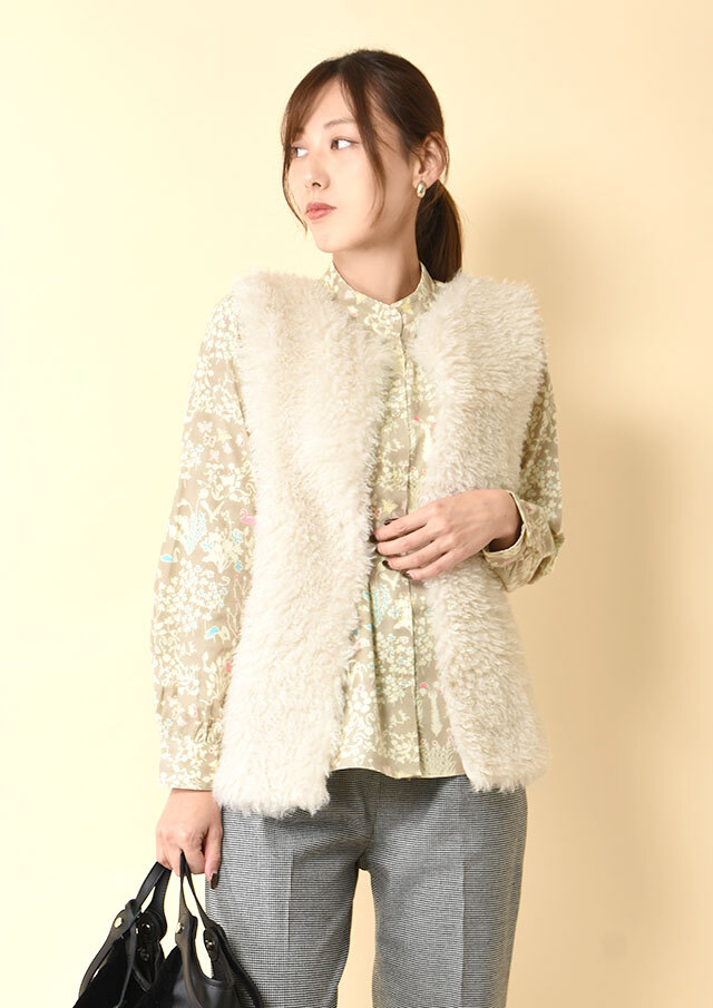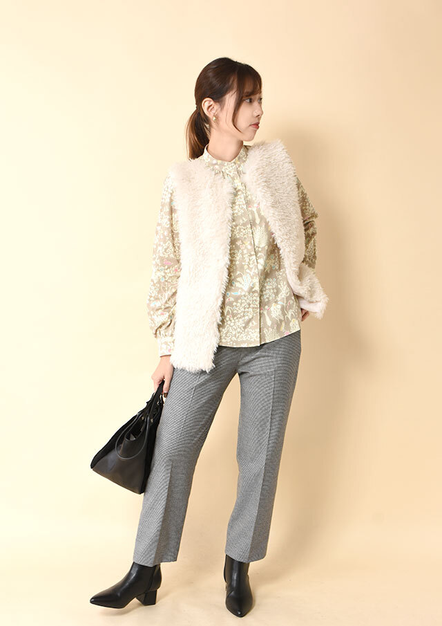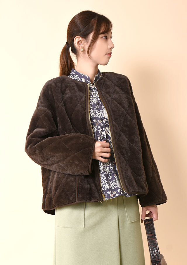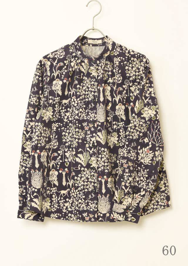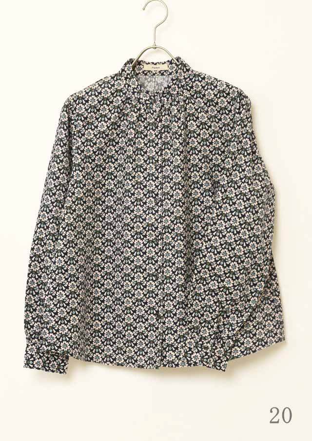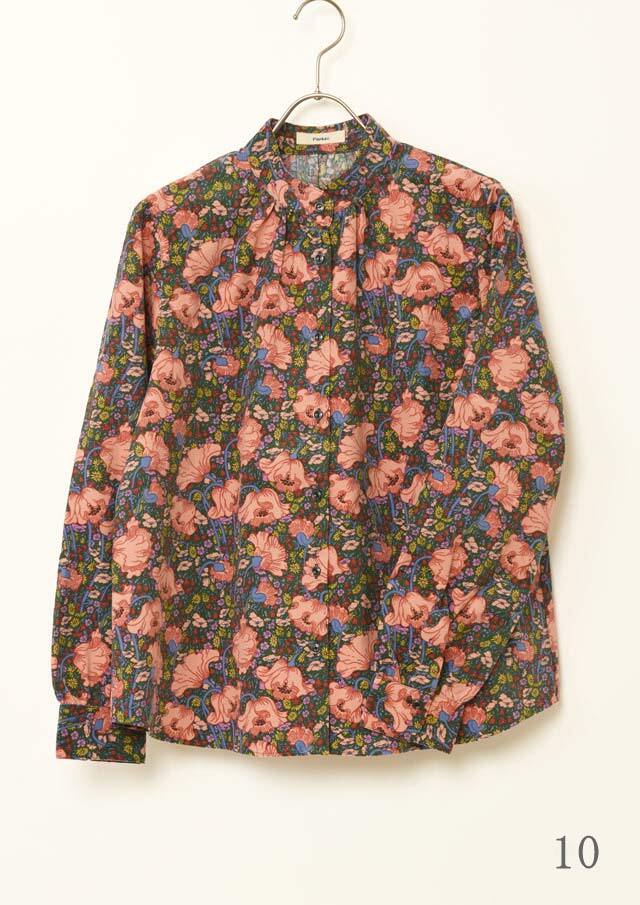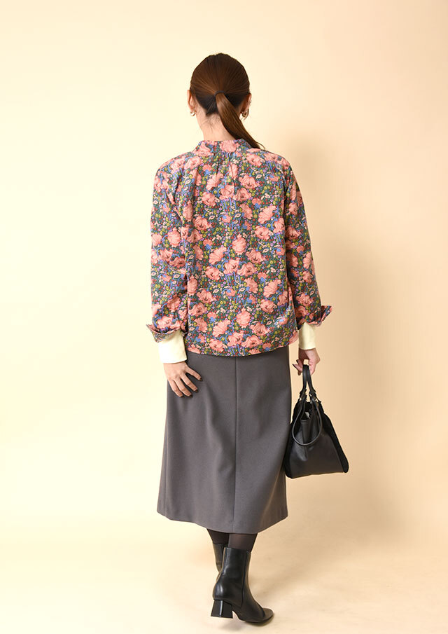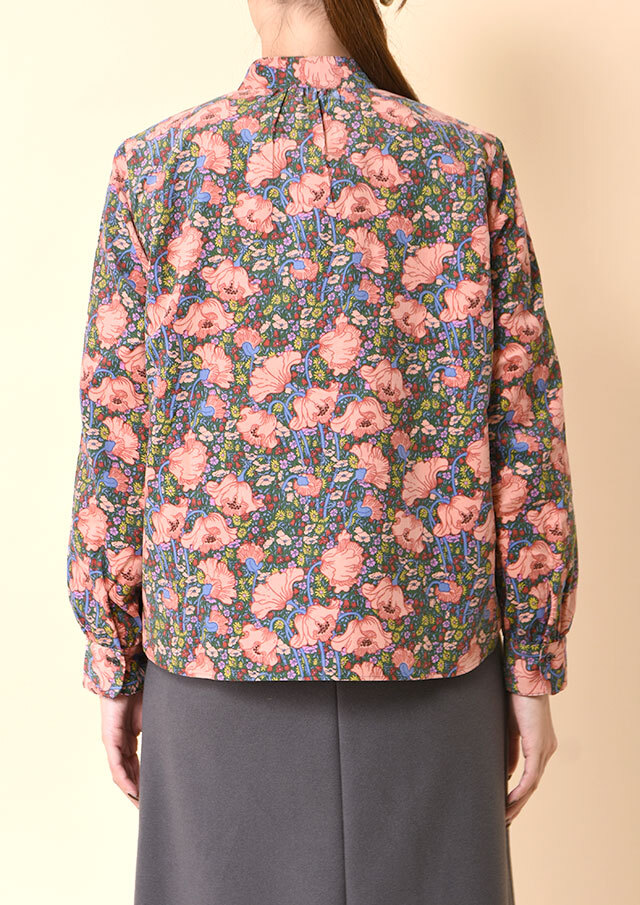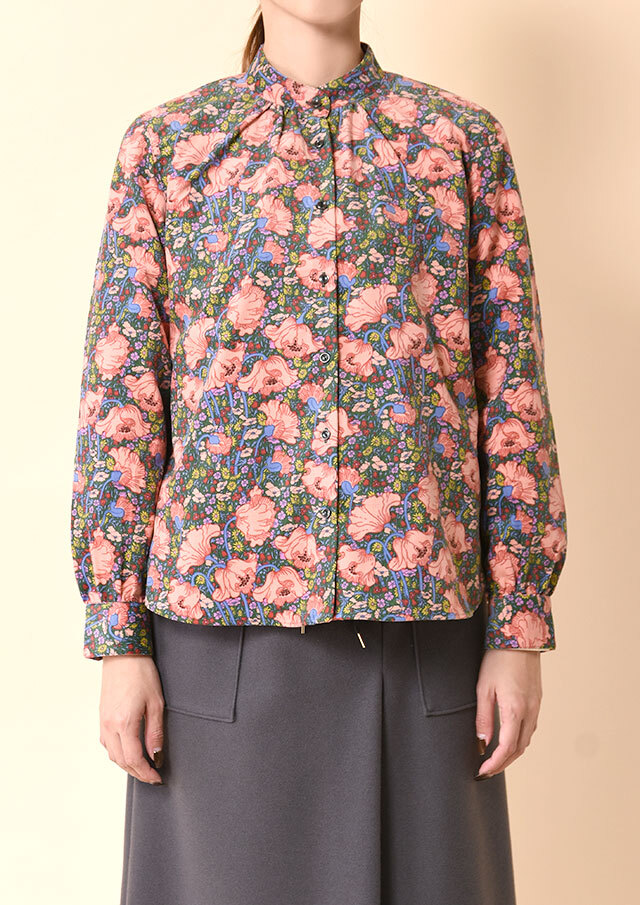 スタンドネックに寄せたギャザーが、ふわりとしたニュアンスをつくる一枚。