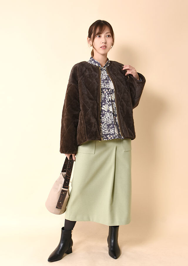 ニットカーディガンの中に入れて、スタンドネックを覗かせると、季節感のあるレイヤードに。