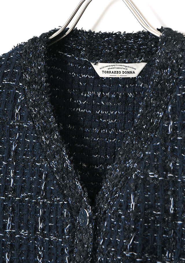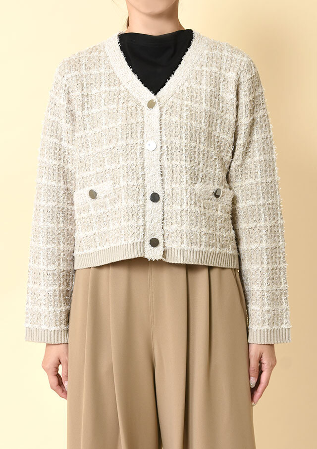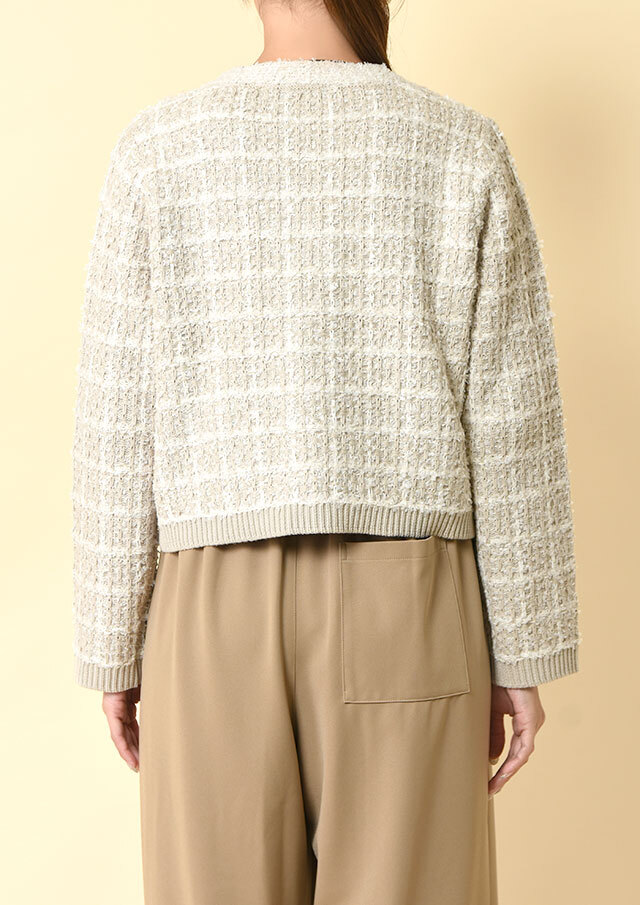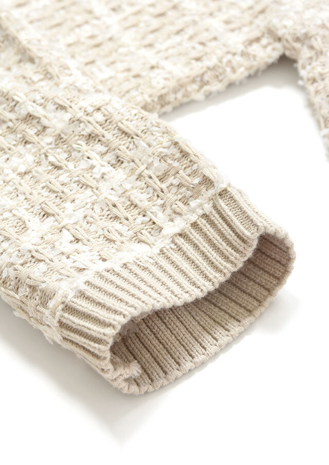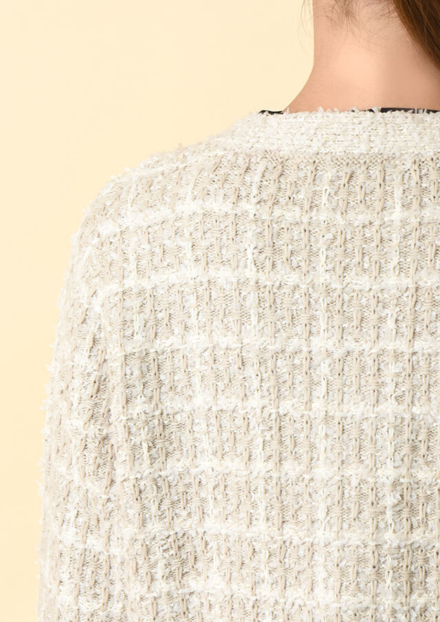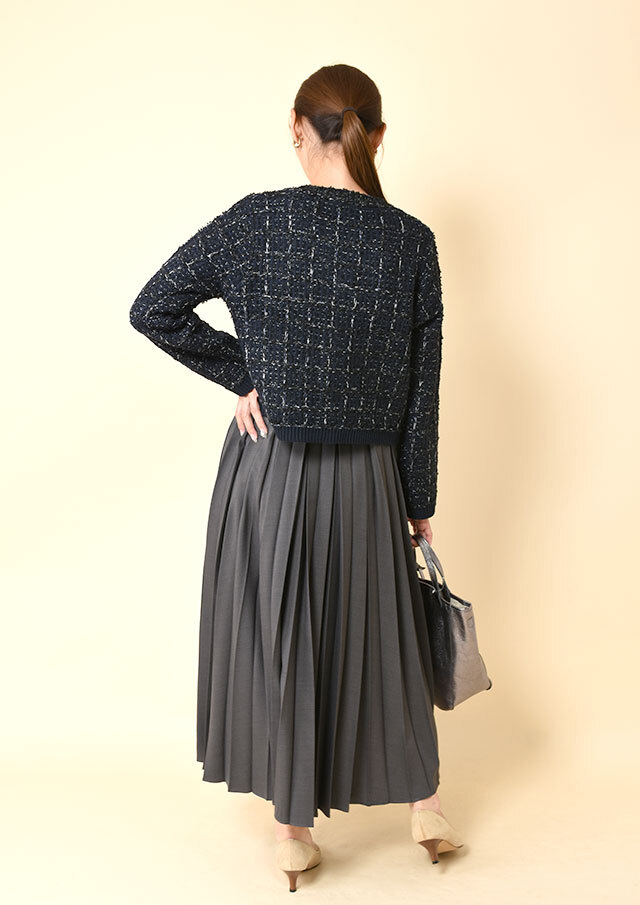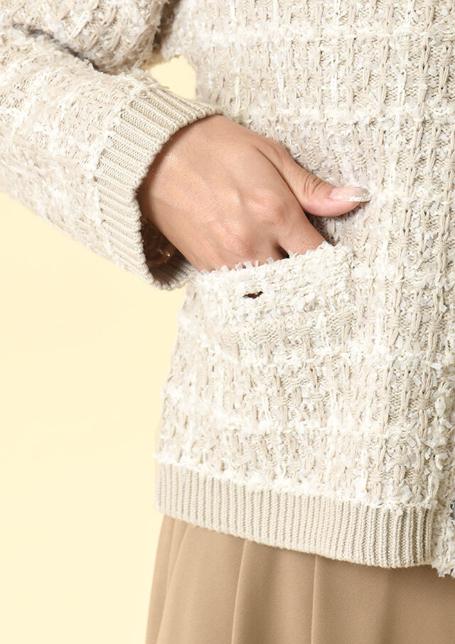 ツイードのようなクラシカルさと、ニット特有のやわらかさを兼ね備えています。