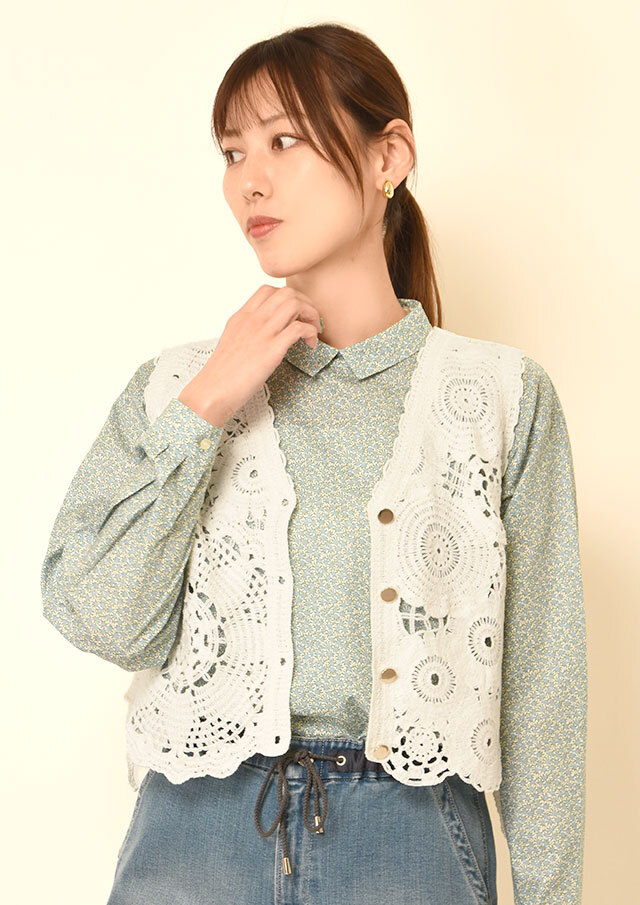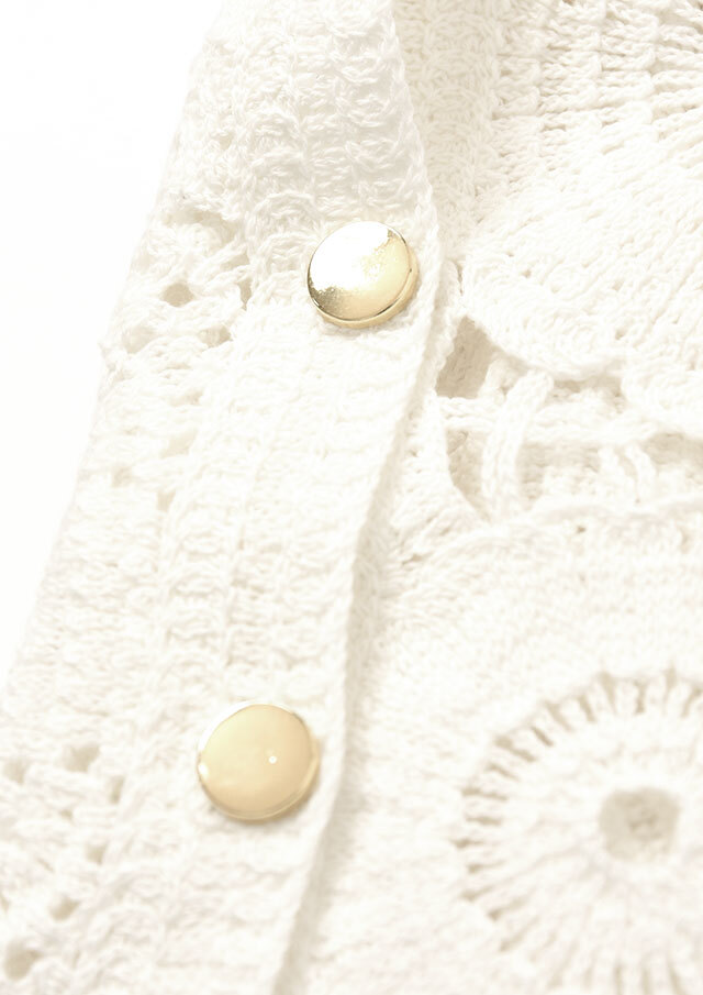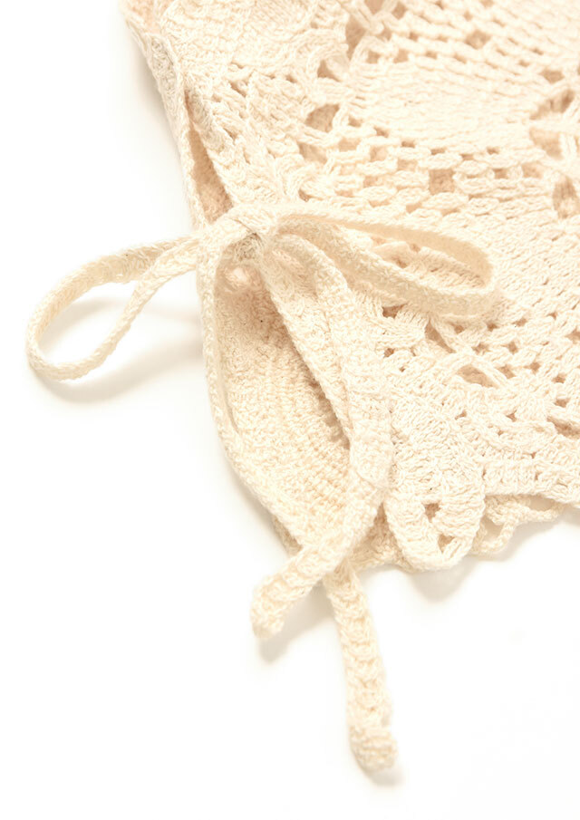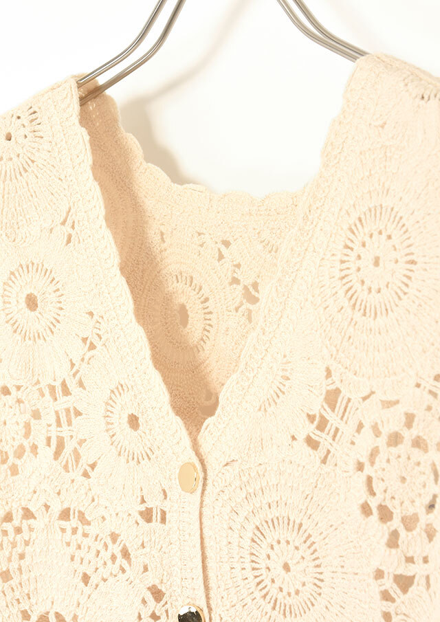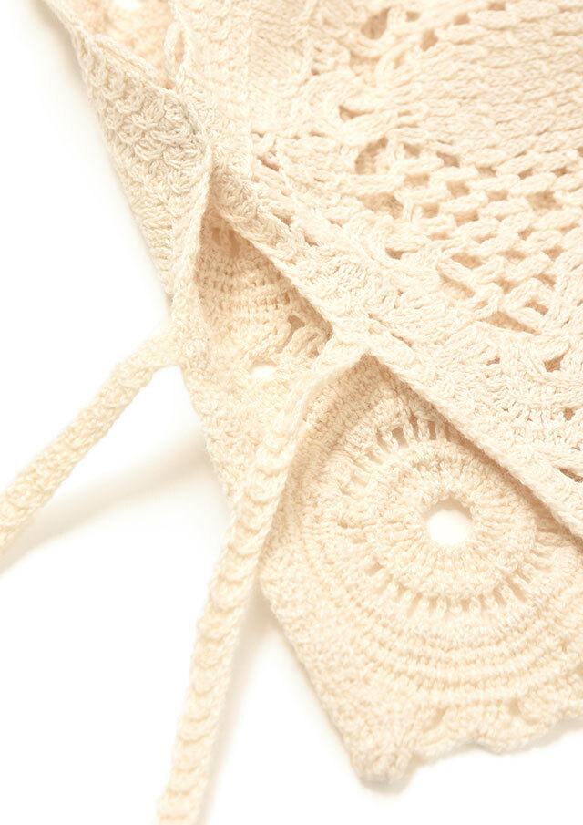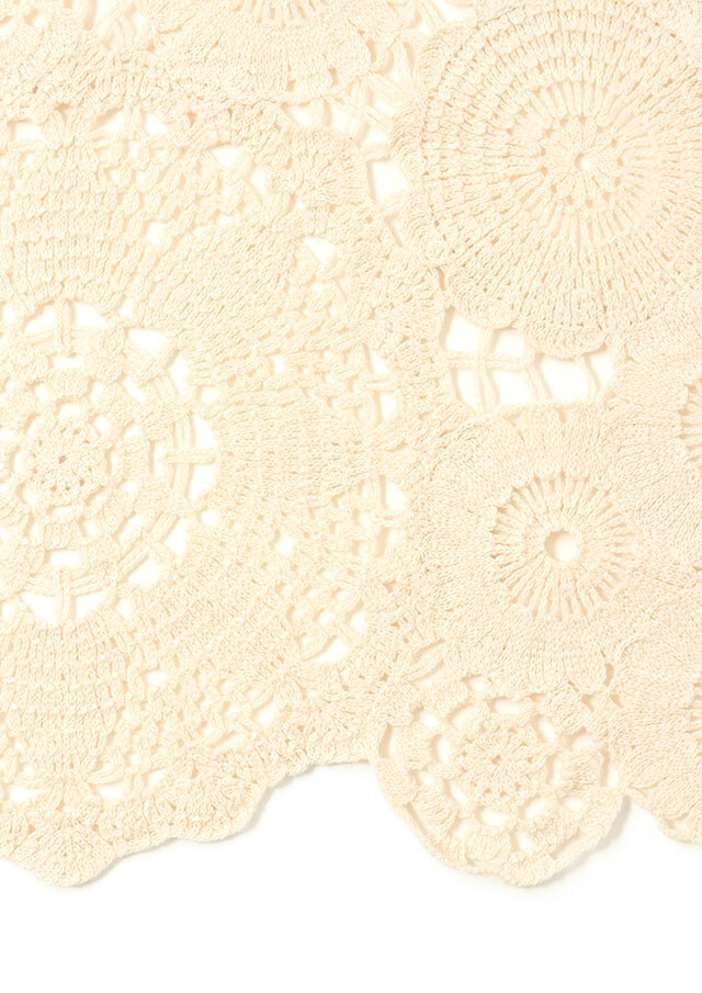 繊細なかぎ針編みの表情が、軽やかでフェミニンな印象を引き立てます。