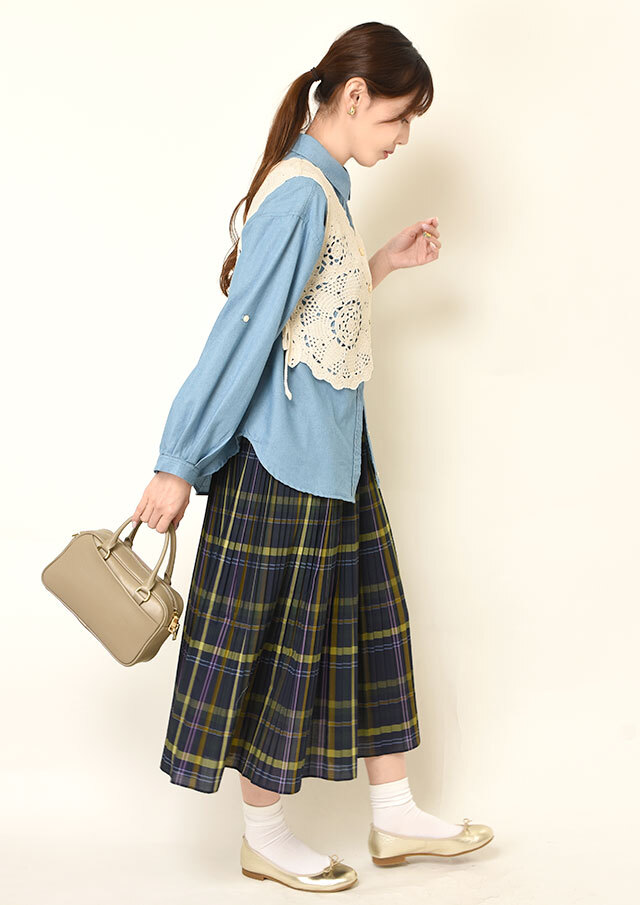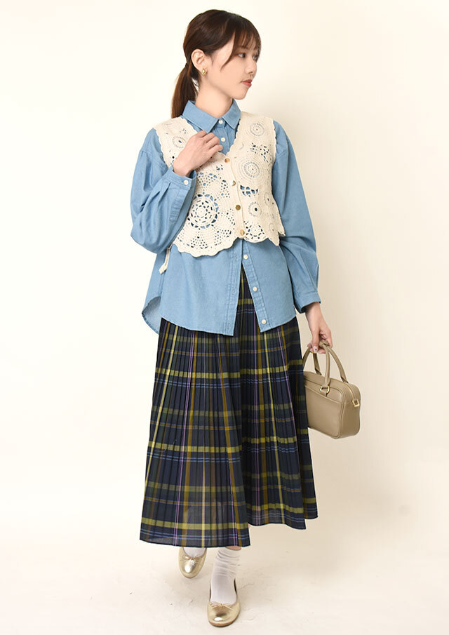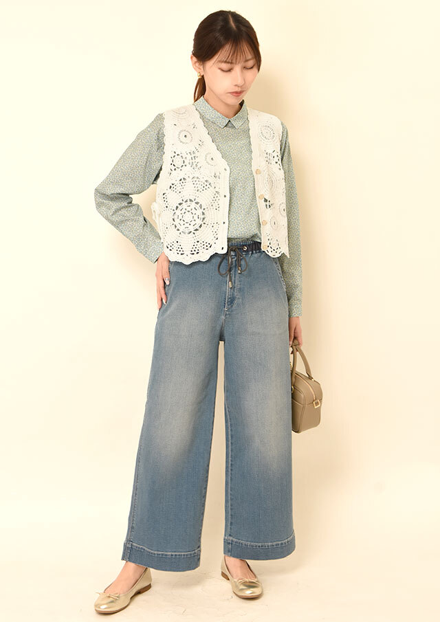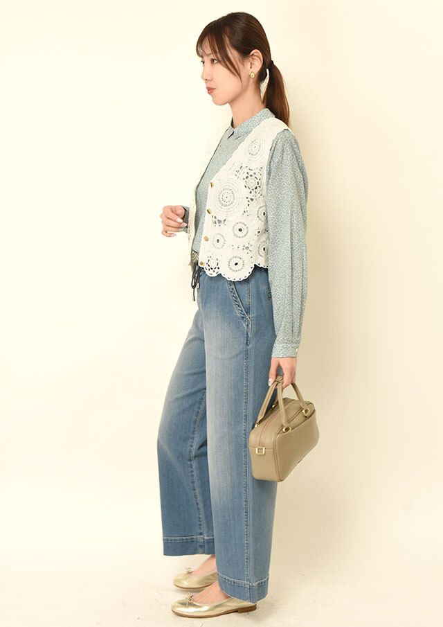 ノースリーブのトップスと合わせれば、ベストの軽やかさが際立って通年で使えそうです。