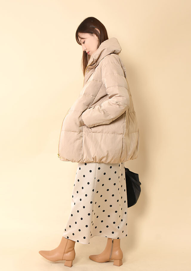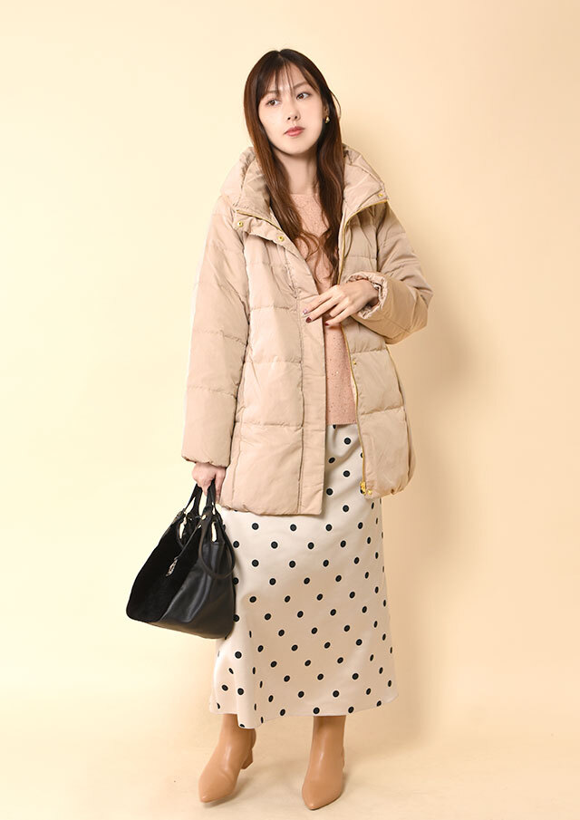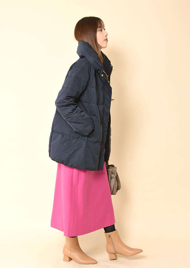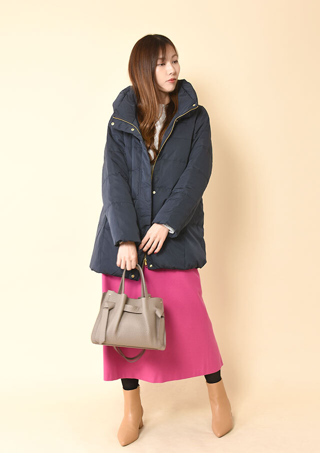 スカートと合わせる場合も、ミドル丈なのでバランスが取りやすく、重たく見えにくいのがポイント。