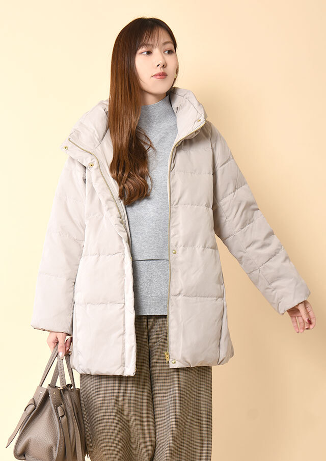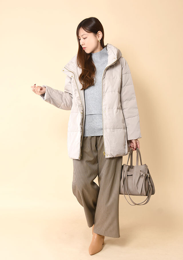 前を閉じて着るとハイネックが際立ち、きちんと感のある雰囲気に◎