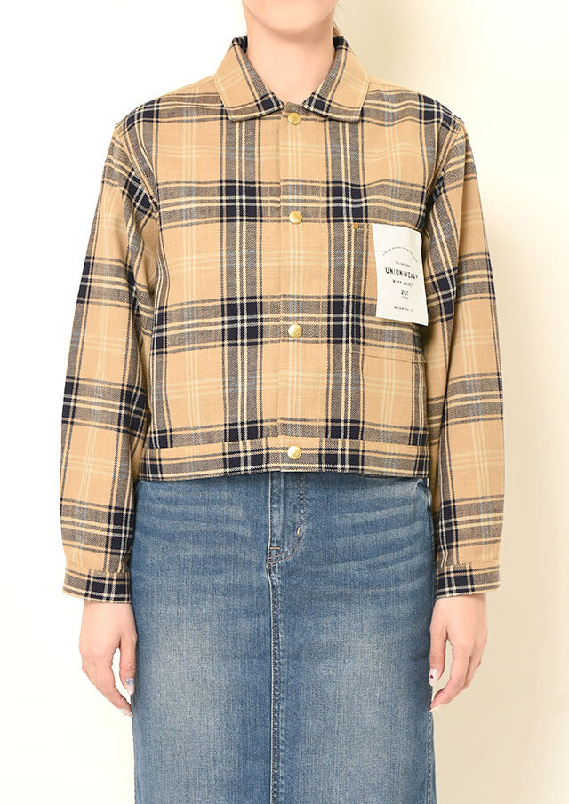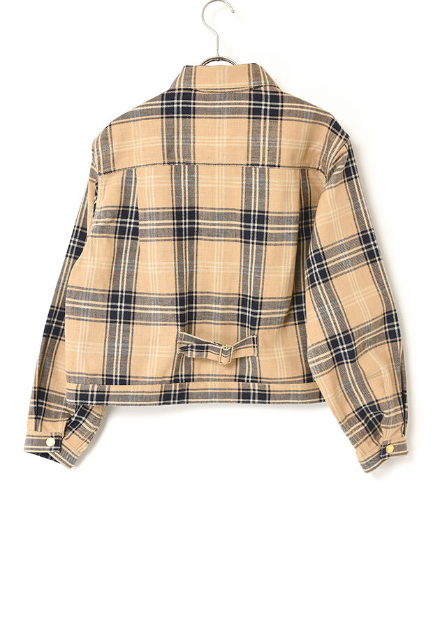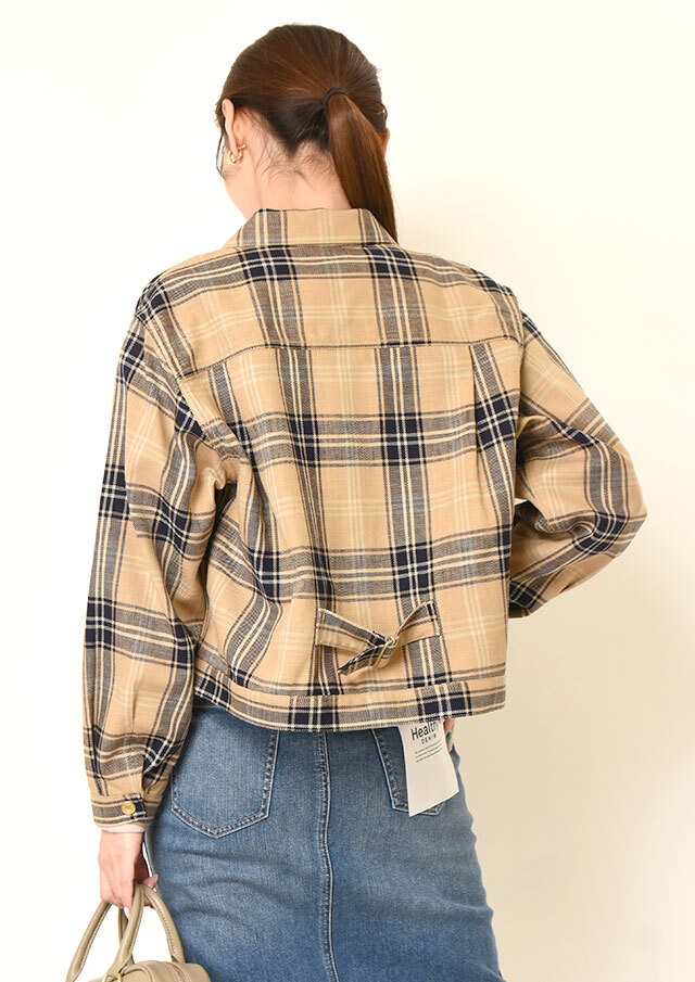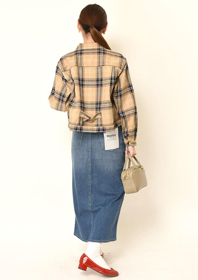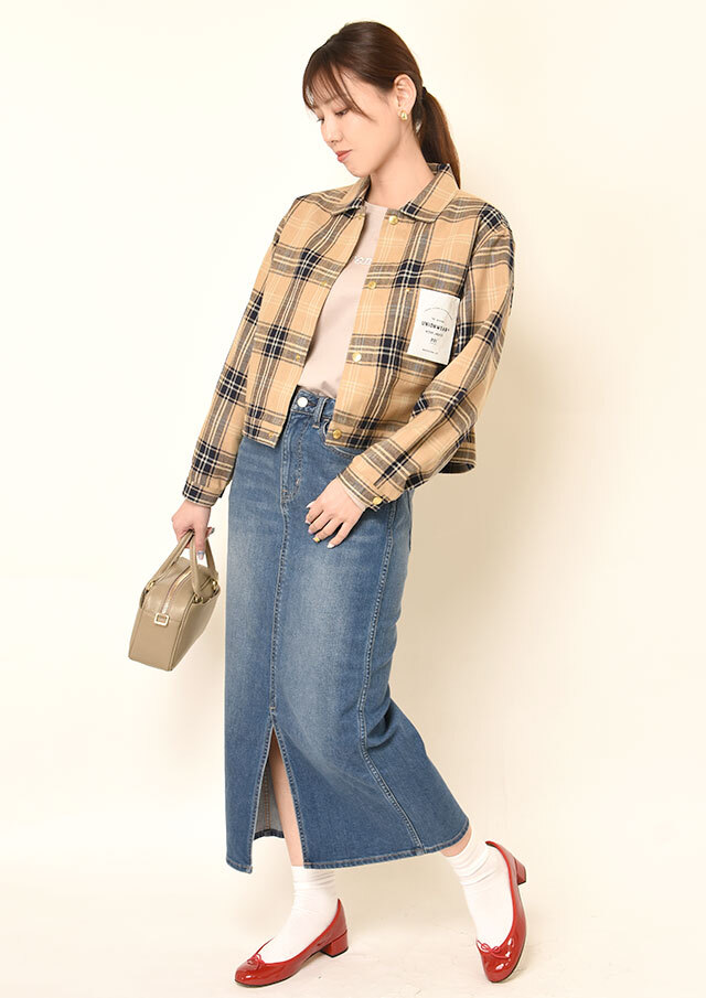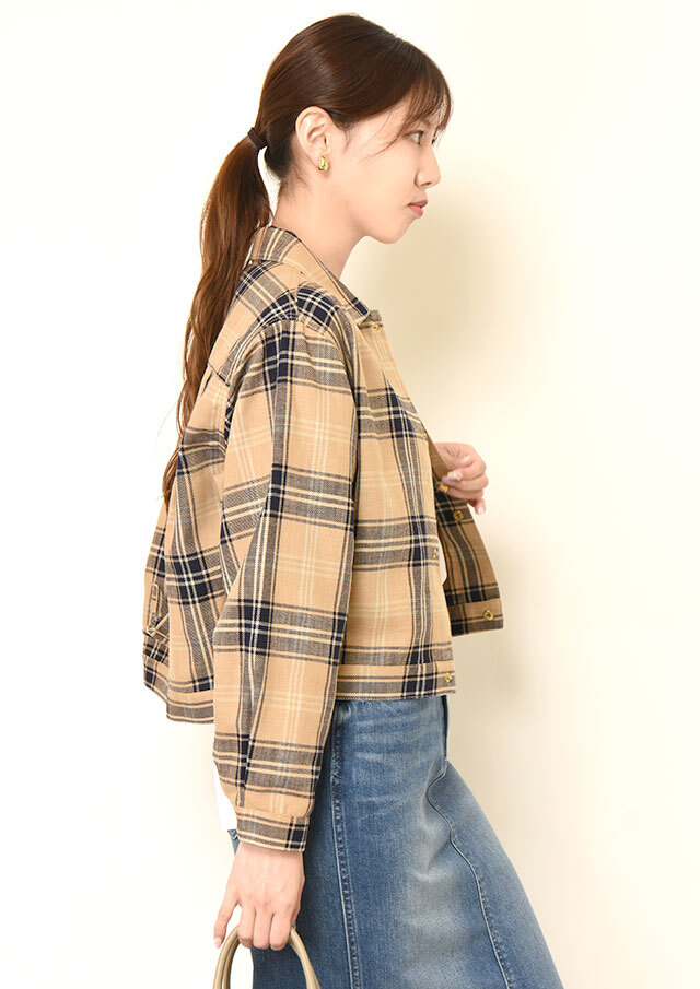 コンパクトな丈感が全体を引き締め、チェック柄が装いに奥行きをもたらします。