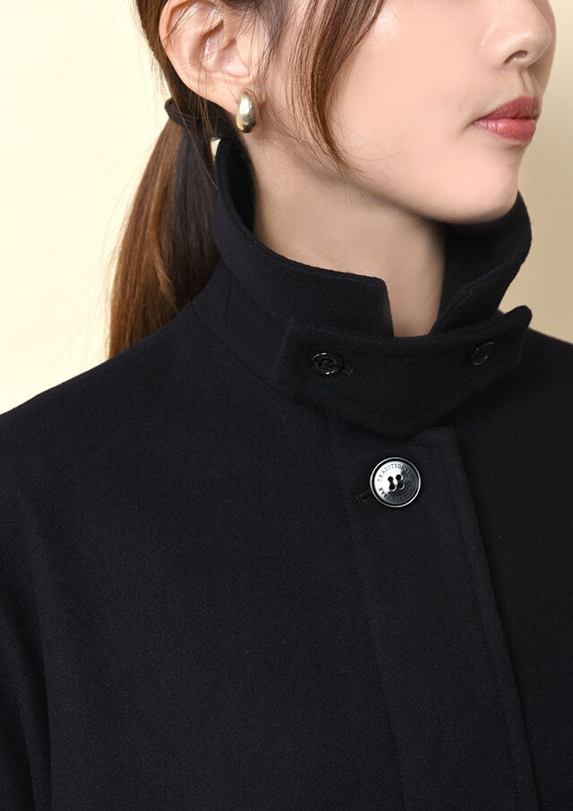 襟を立て、裾裏部分に隠されたチンタブで留めれば、端正でモードな印象に変化。