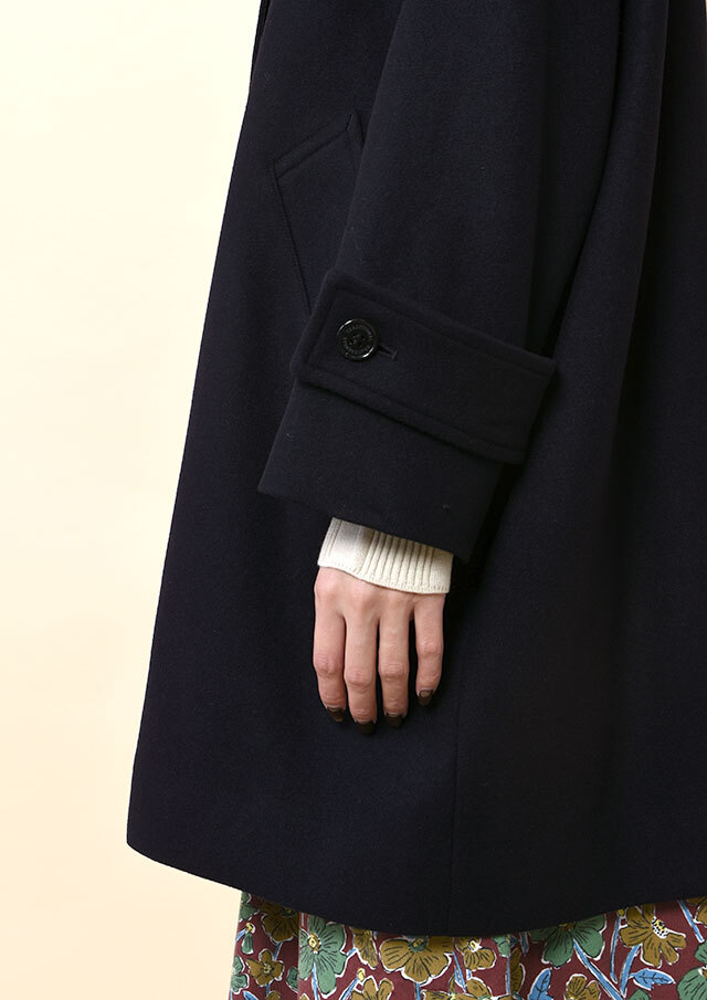 無駄を削ぎ落とした上品な佇まいの中に、袖口のベルトディテールやチンタブ仕様がほどよいアクセントを添えています。