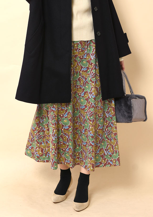 スカートスタイルなら、プリーツやIラインスカートで縦のラインを意識すると◎