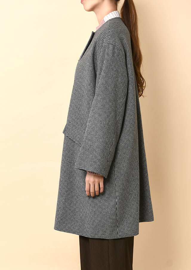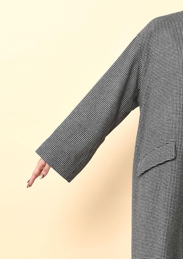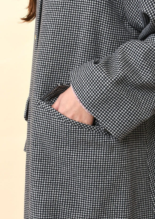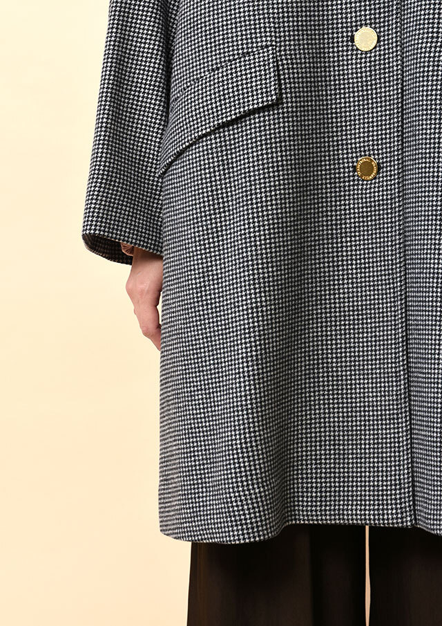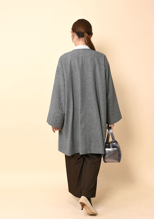ワイドパンツやロングスカートと組み合わせれば、ゆったりとしたAラインと千鳥格子の柄が映え、冬のモードなスタイルが完成。