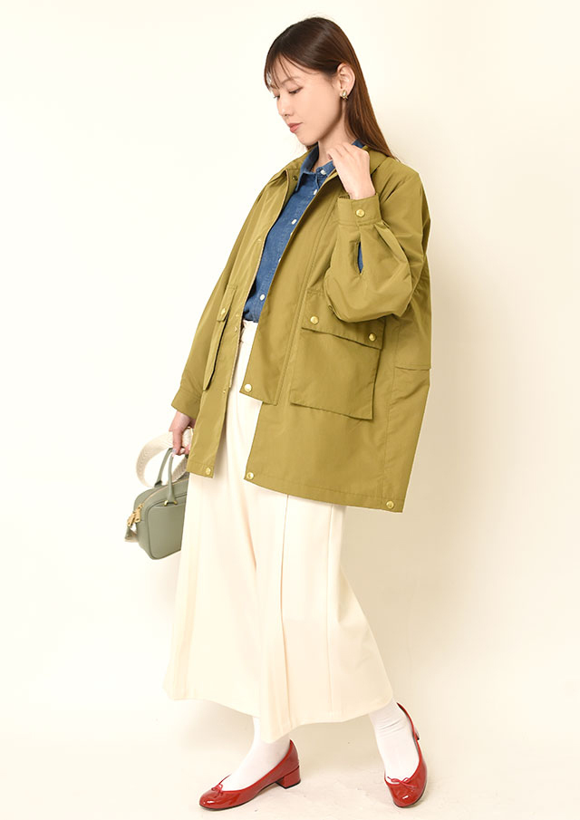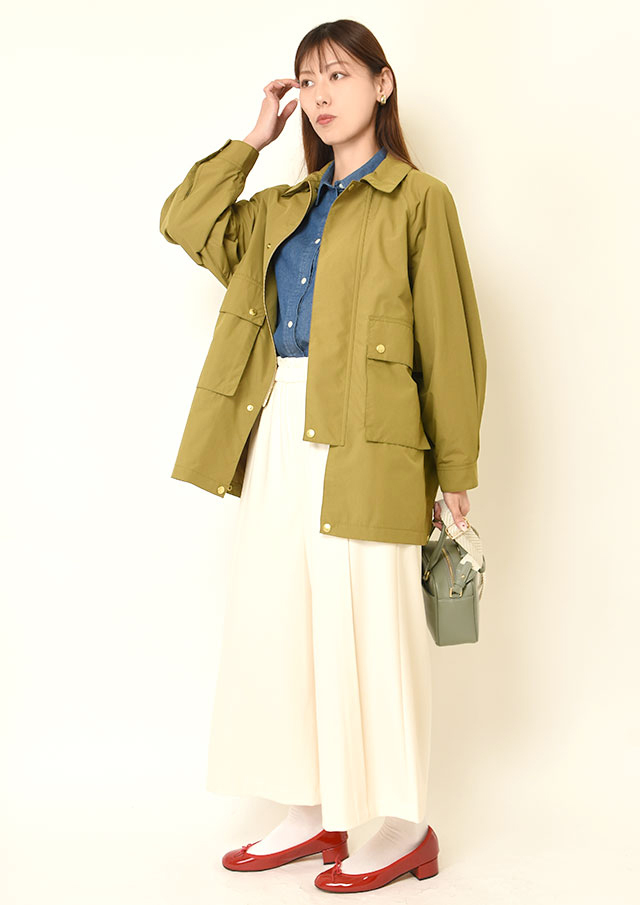 ロングスカートと組み合わせ、裾を折り上げてショート丈で着こなせば、重心が整い洗練されたバランスに。