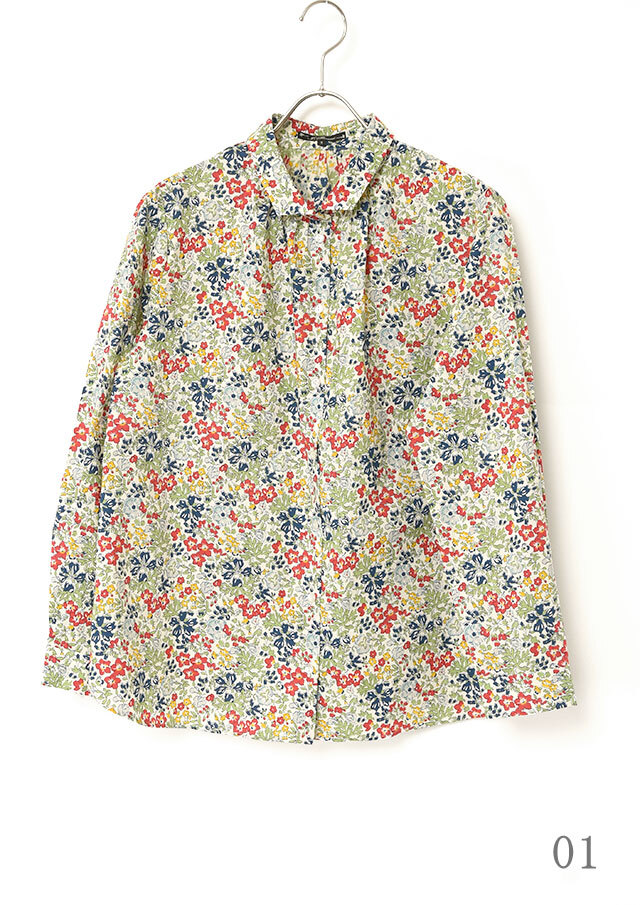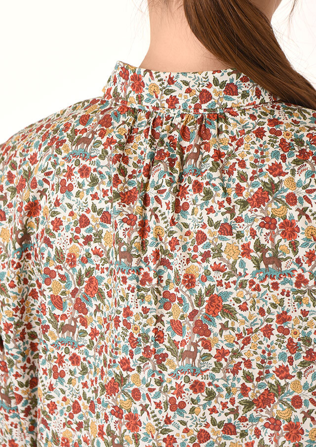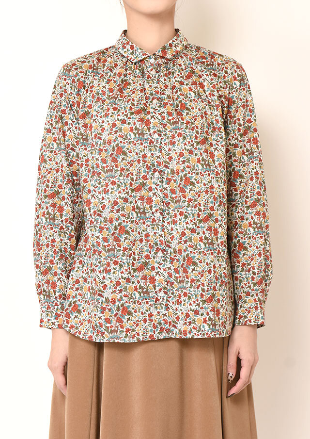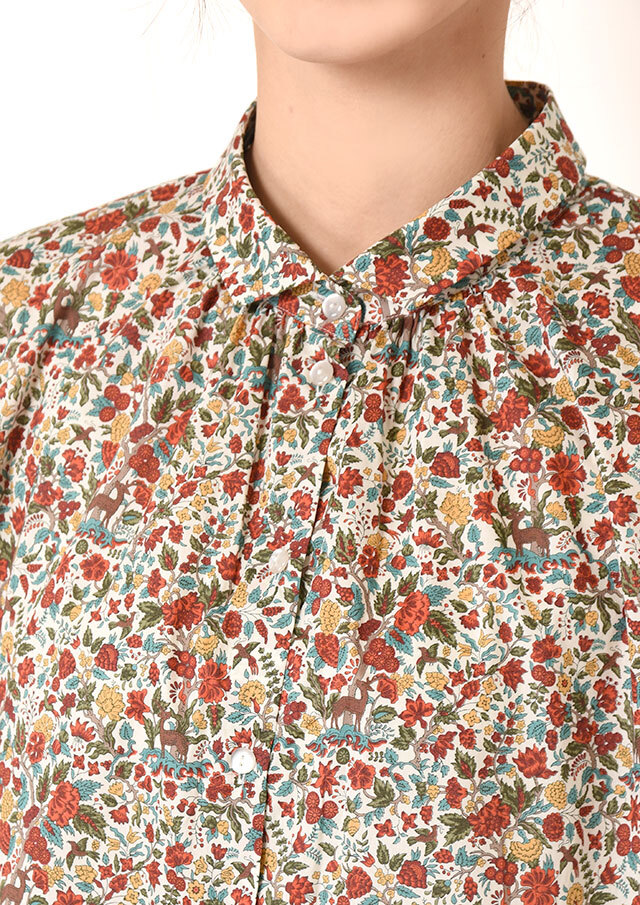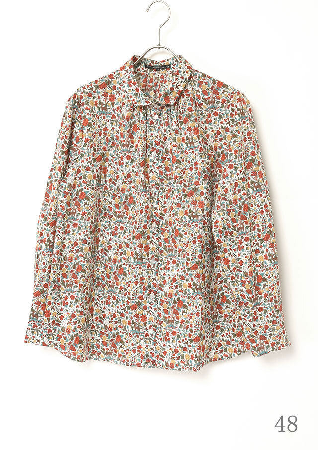 シンプルなシャツながら、ギャザーとタックによってフェミニンな印象が自然に加わるデザインです。