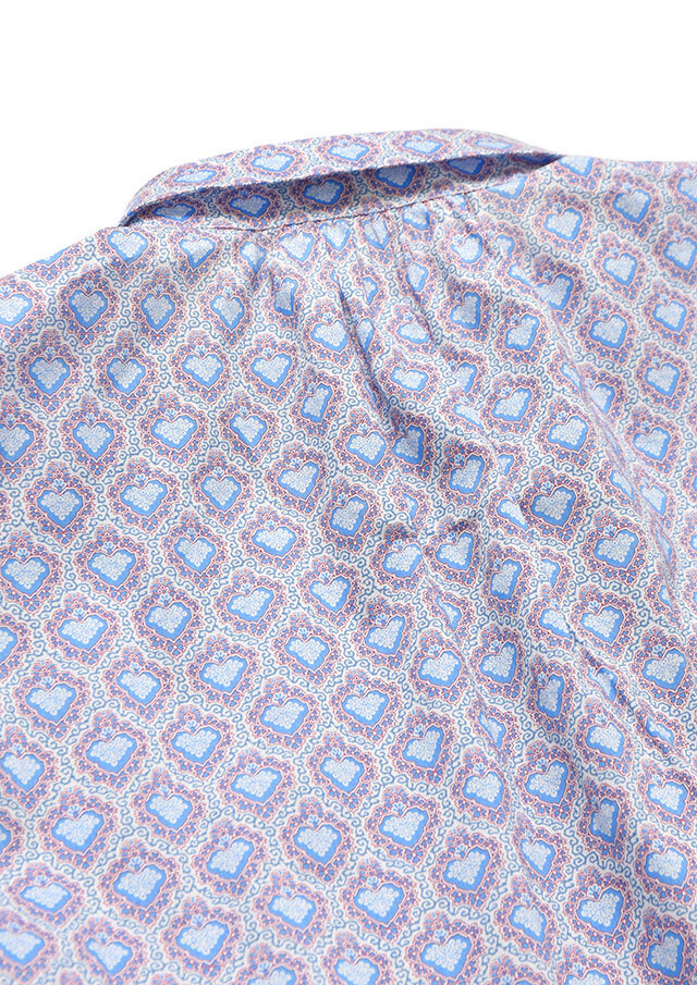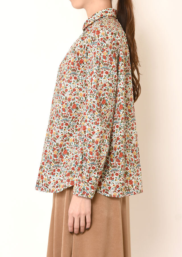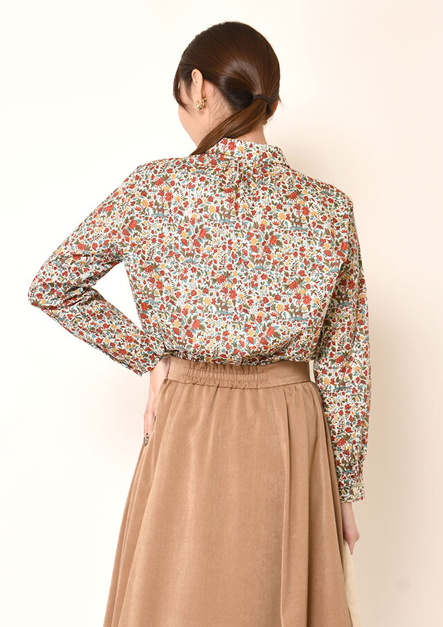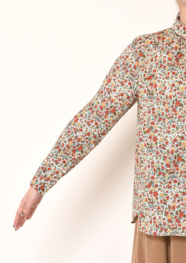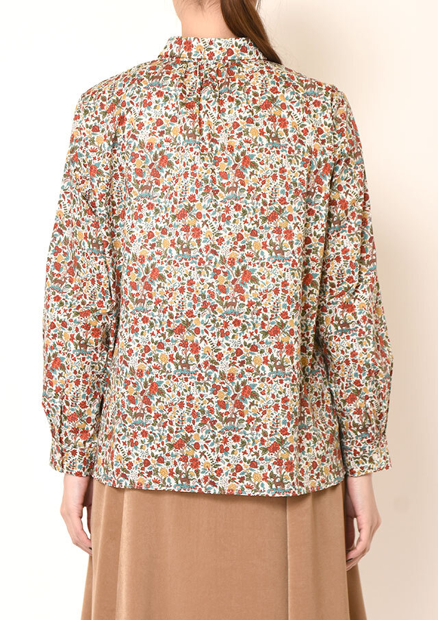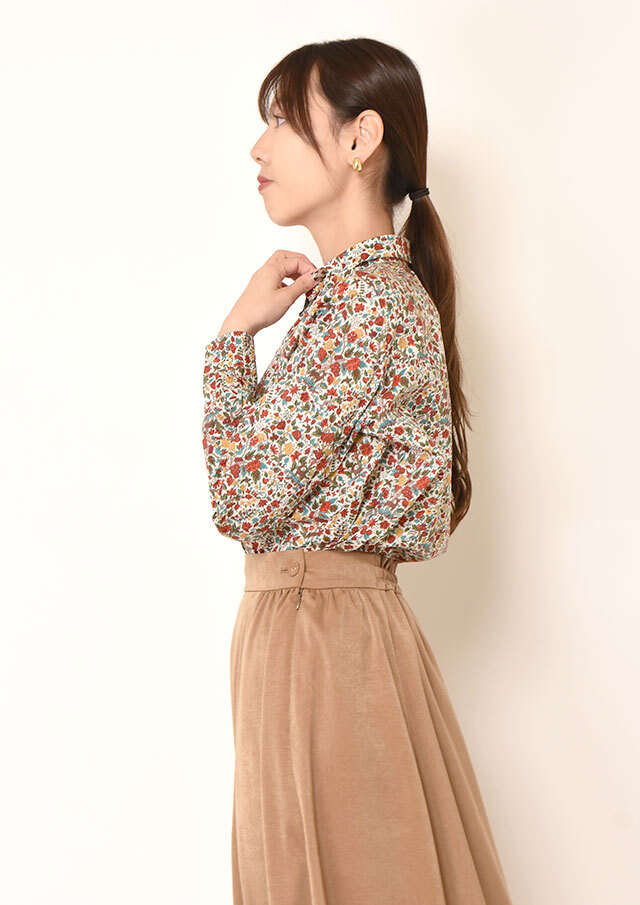 シンプルなシャツながら、ギャザーとタックによってフェミニンな印象が自然に加わるデザインです。
