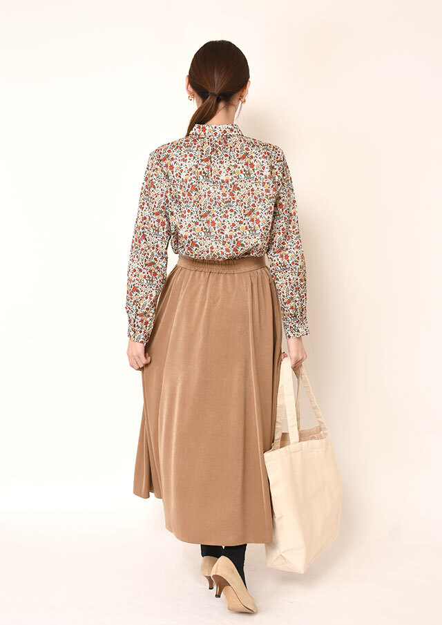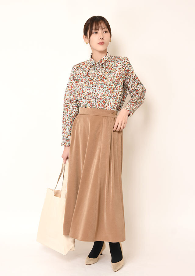 スカートと合わせると、袖口のカフスとタックが手元にアクセントを添え、やさしい印象のスタイルに。