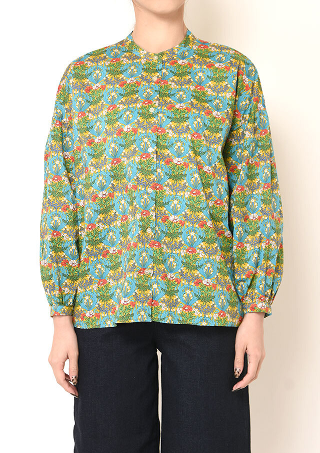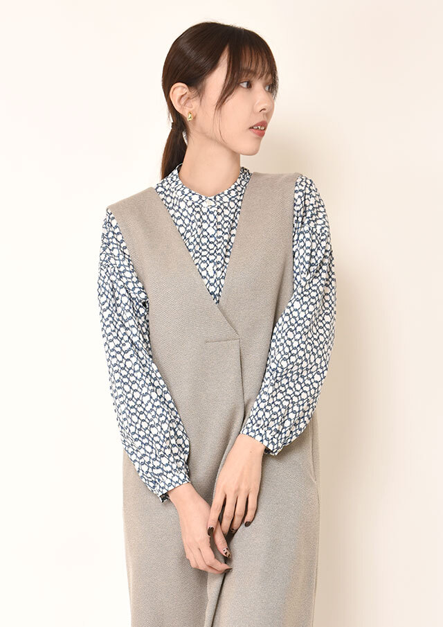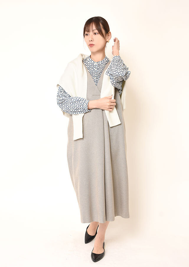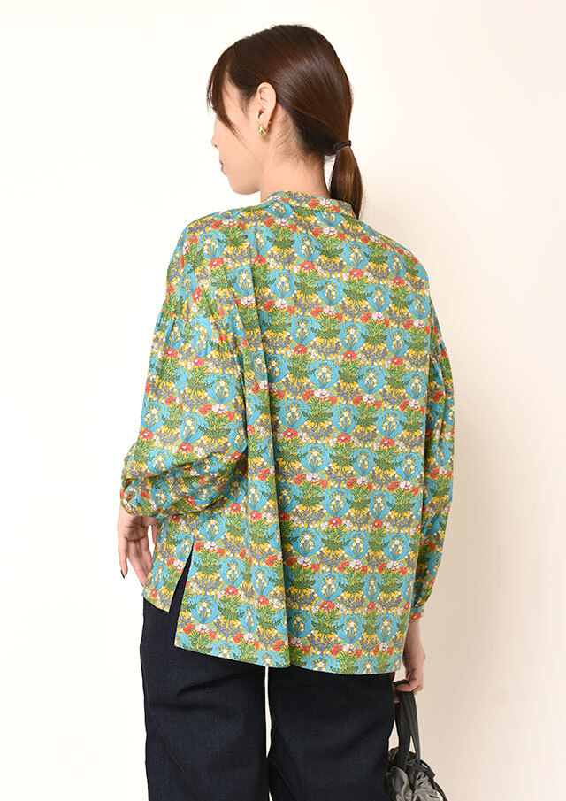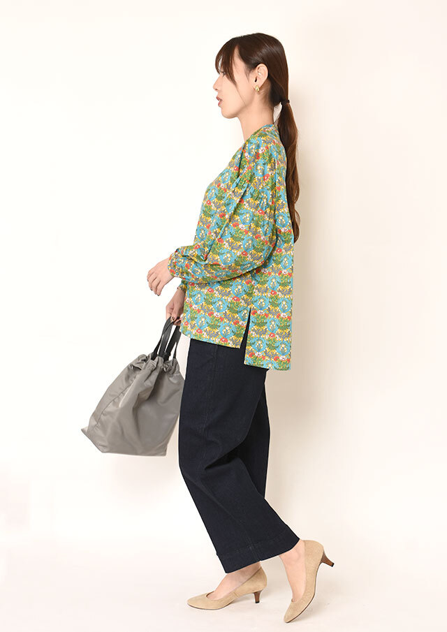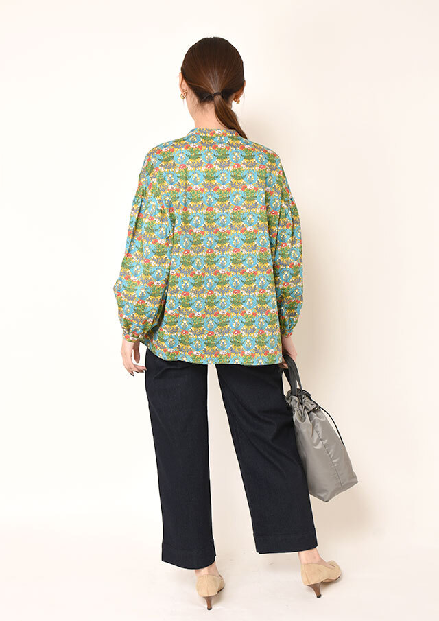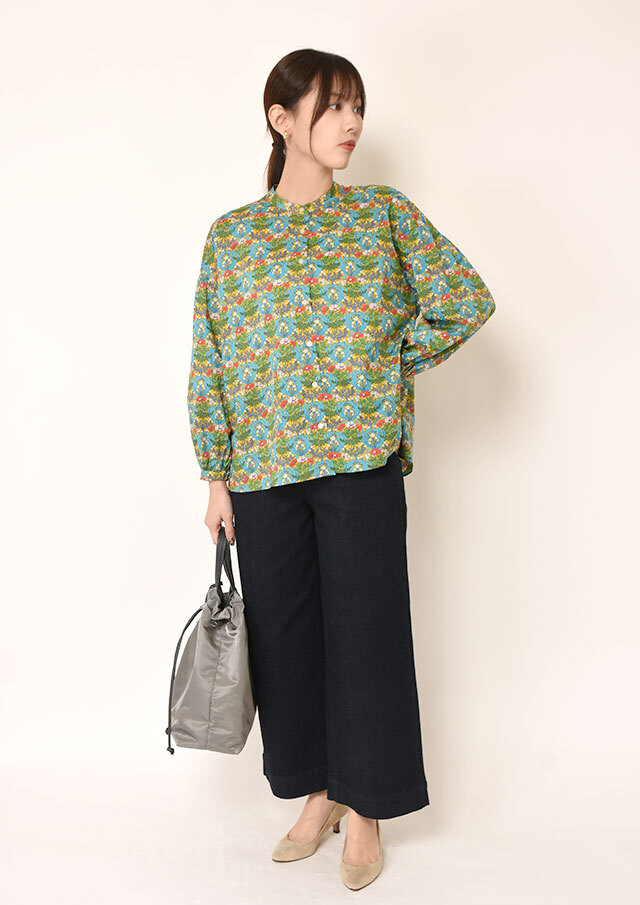 一枚で着ると、ふんわりとした袖のボリュームとバンドカラーのスッキリ感が際立ち、程よく力の抜けた印象に。