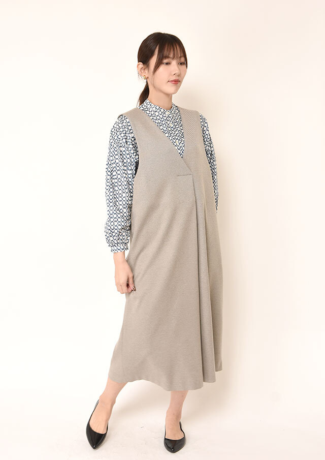 バンドカラーとタートルの重なりが首元に表情を生み、きちんと感のあるレイヤードスタイルが完成します。
