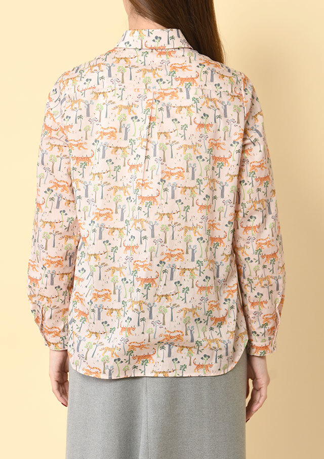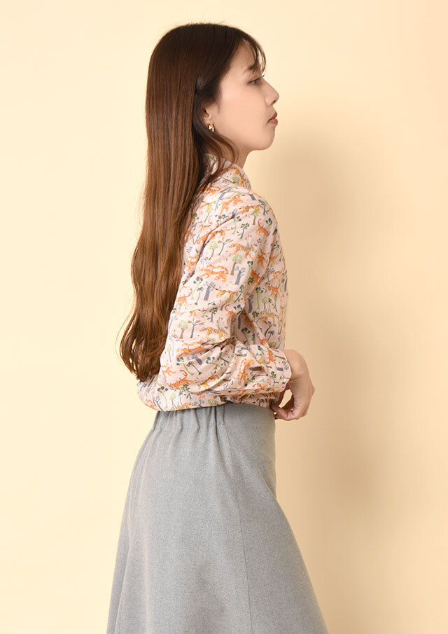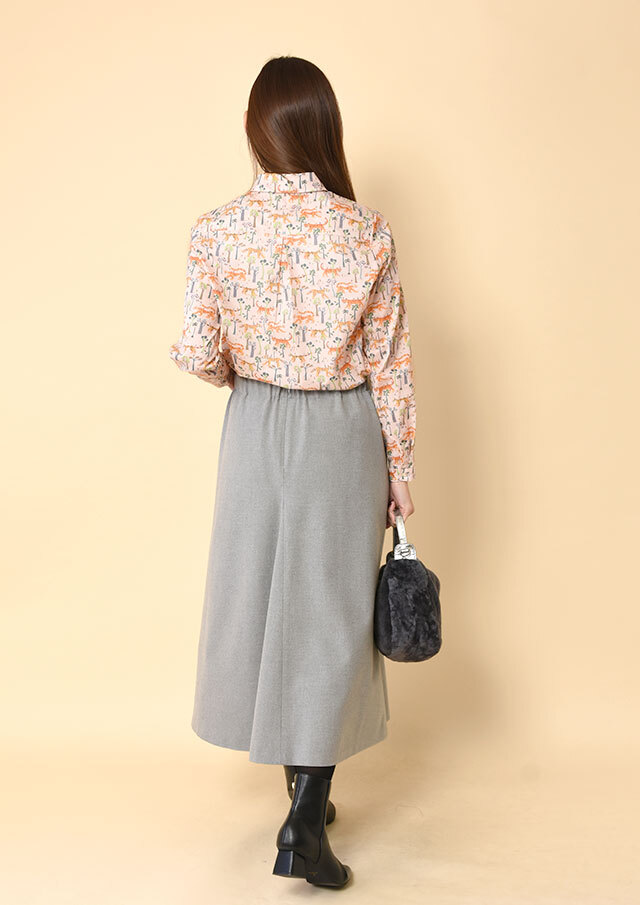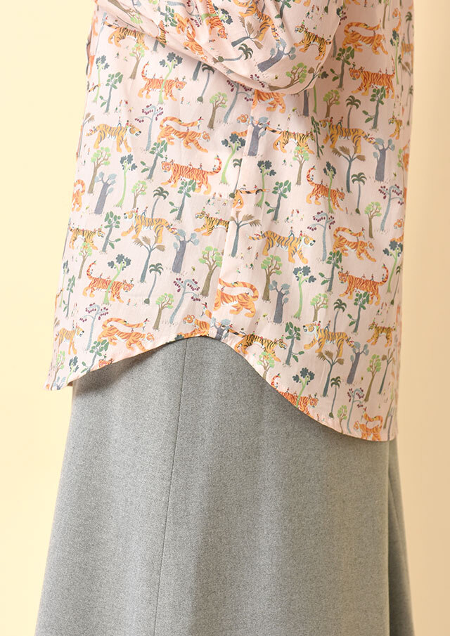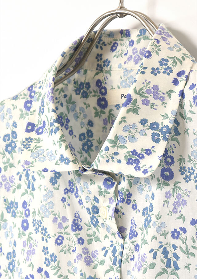 タナローンのなめらかさを引き立てたい日は、ボタンを上まで留めて、丸襟の愛らしさをきれいに見せる着こなしがオススメです。