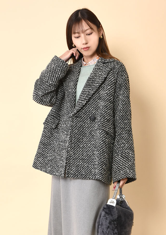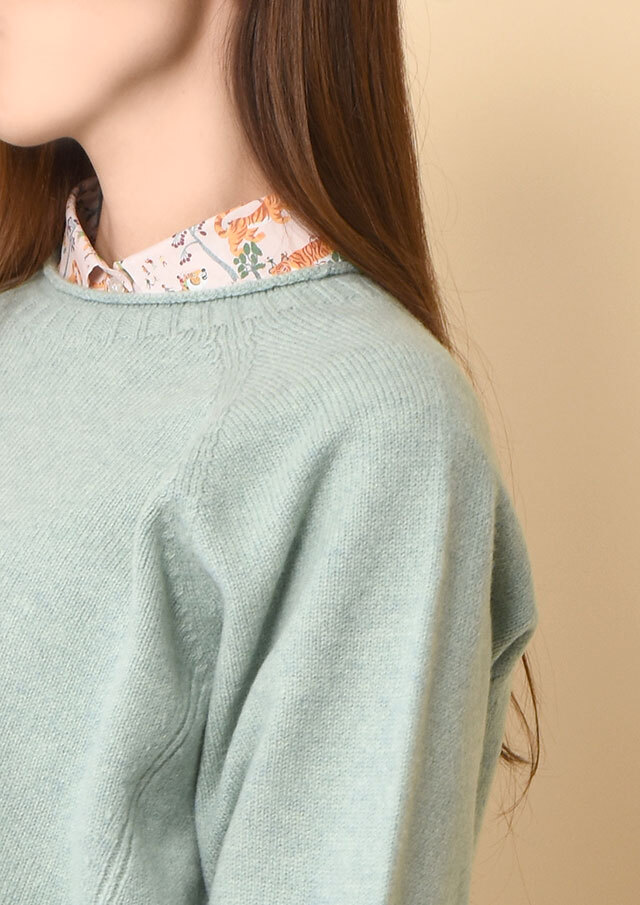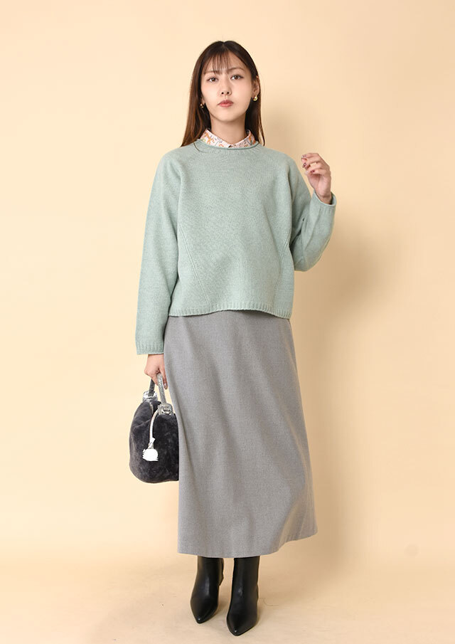 丸襟が少しのぞくだけで、やわらかなアクセントとなり、冬の装いにも軽やかさを添えてくれます。