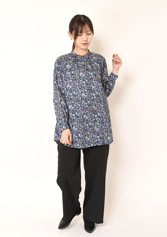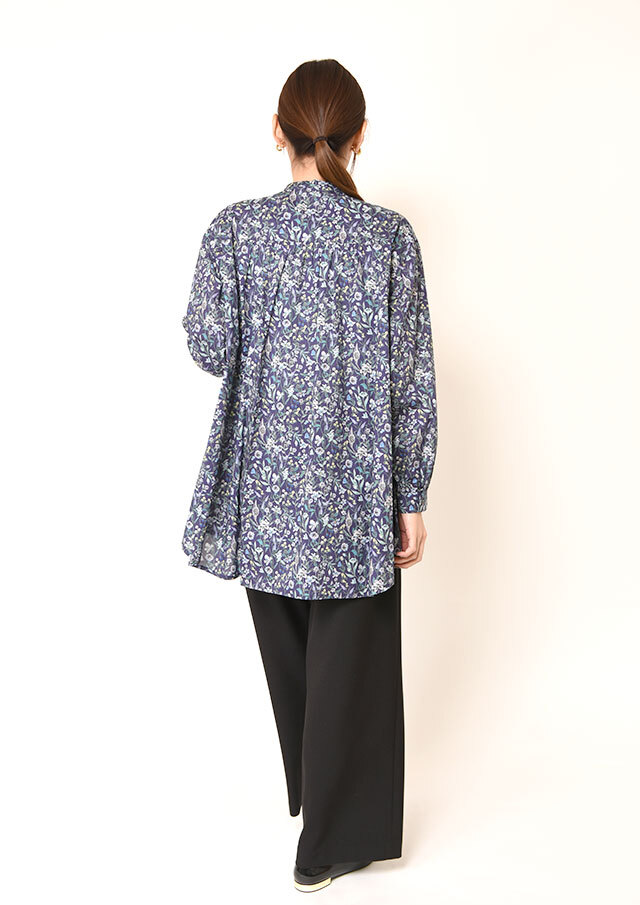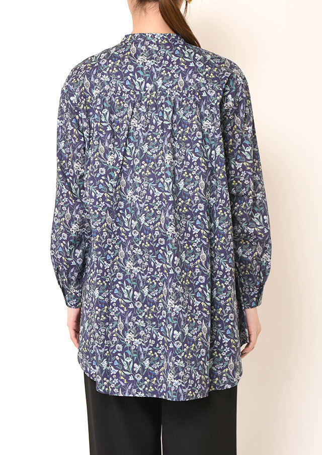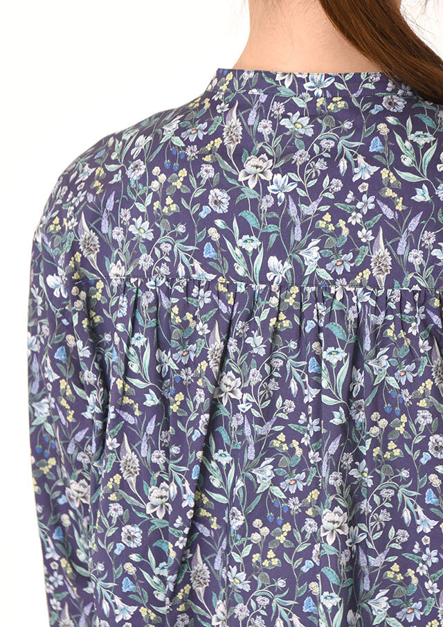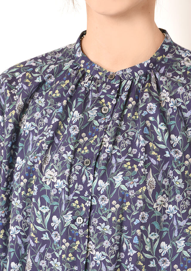 バンドカラーに、フロントだけ控えめに入ったギャザーがやわらかな表情をプラス。