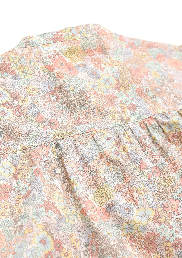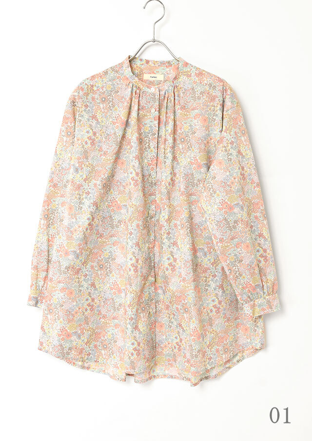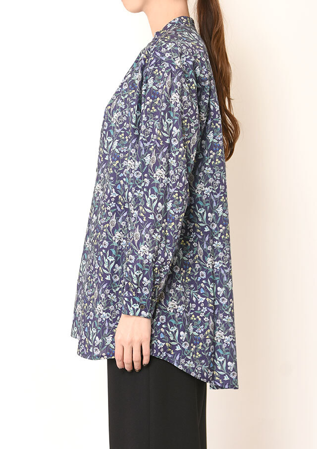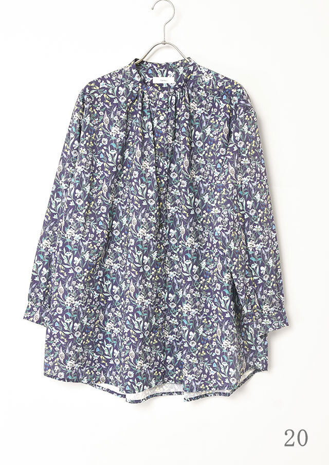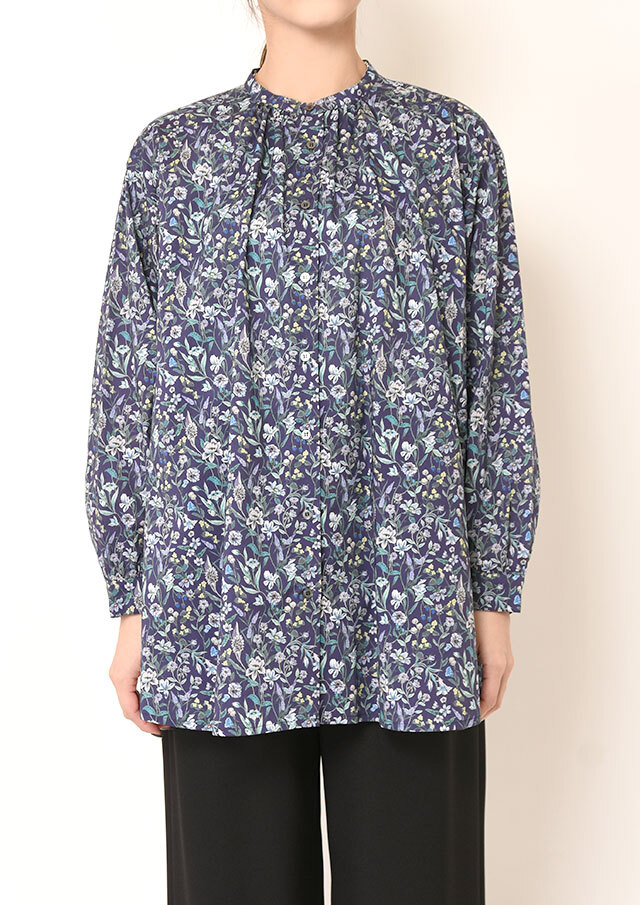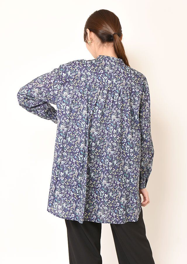 バンドカラーに、フロントだけ控えめに入ったギャザーがやわらかな表情をプラス。