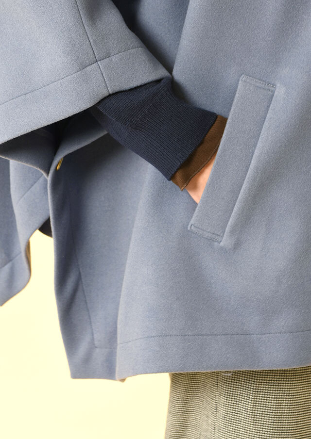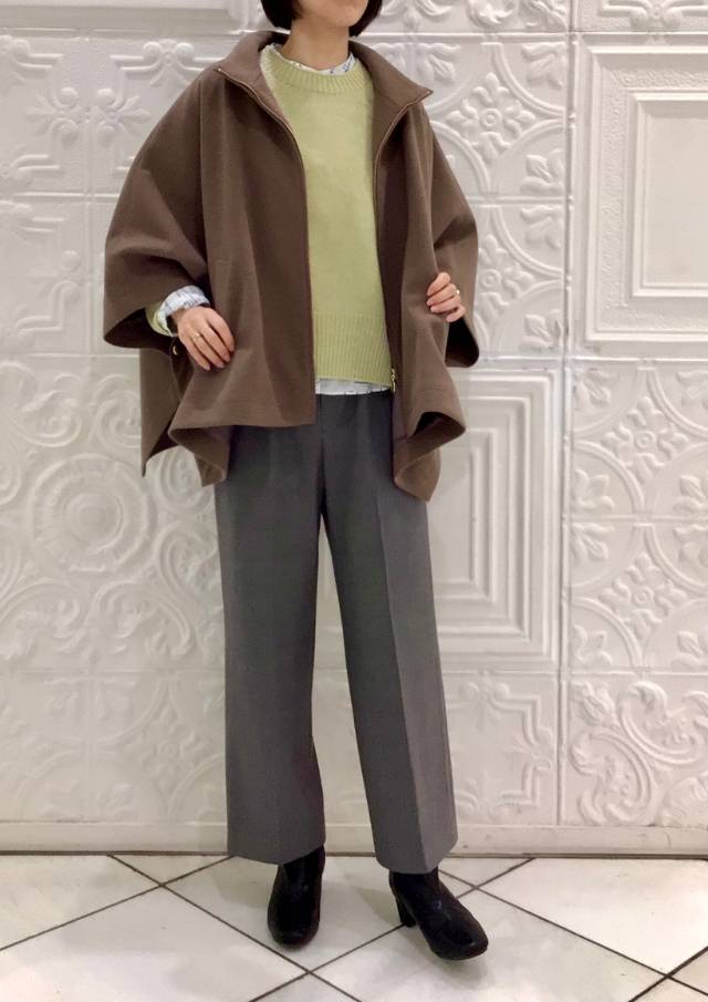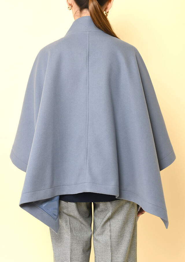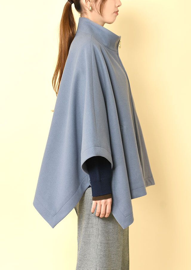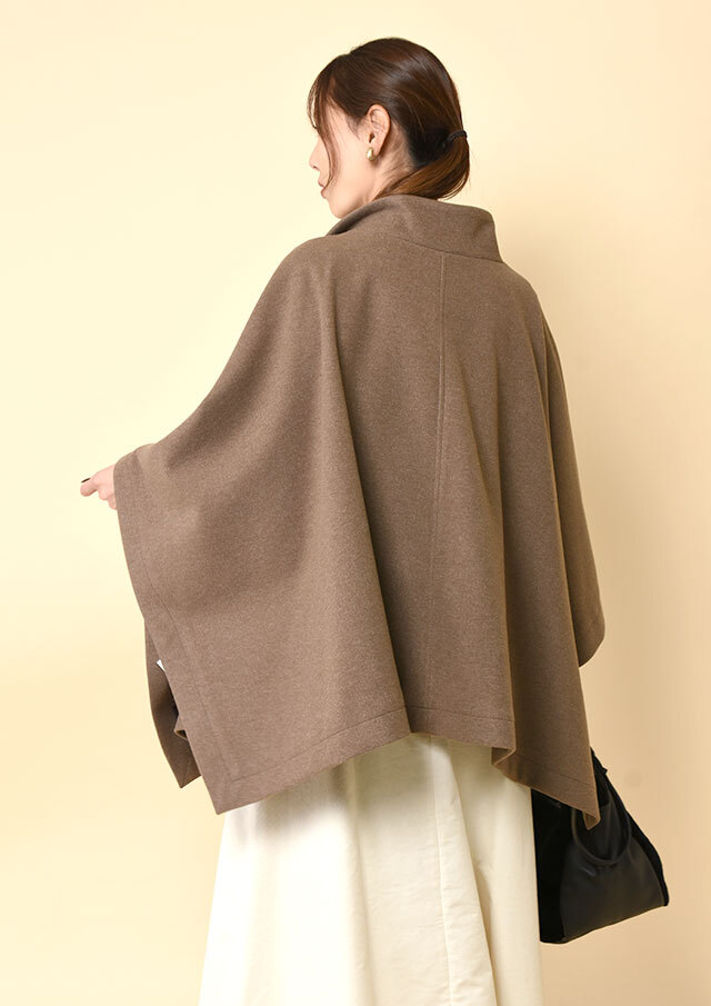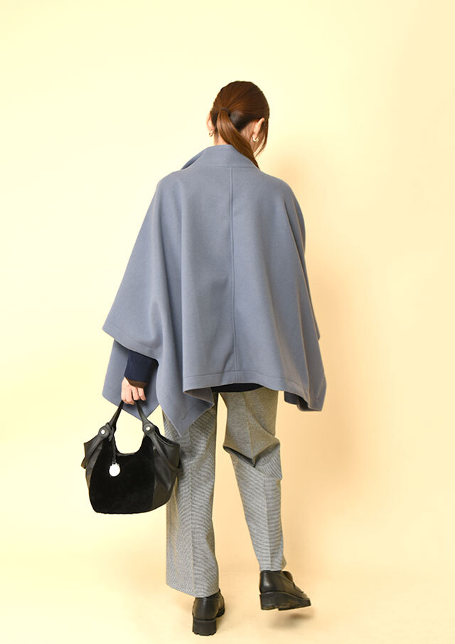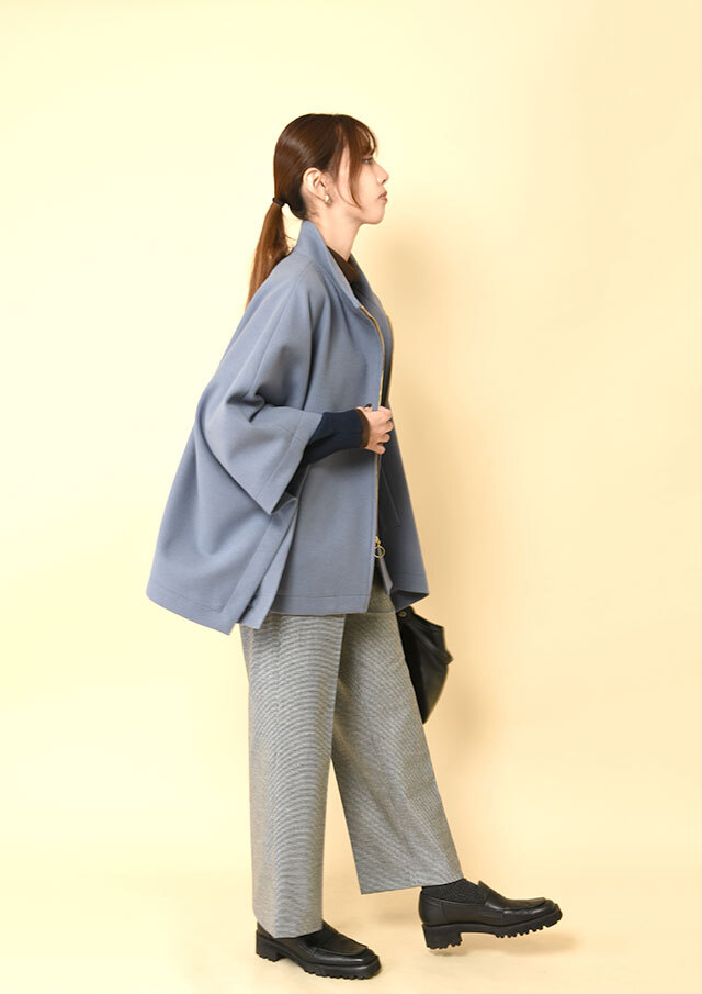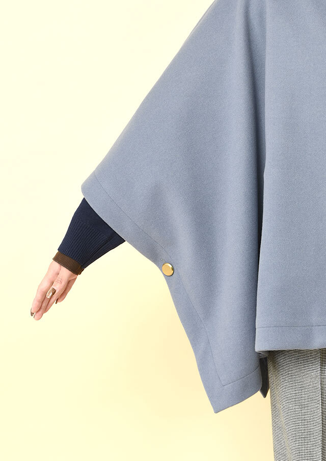 ポンチョらしいゆとりのあるフォルムながら、バランスのとれた丈感で全体がもたつかず、軽やかに見えるデザインです。