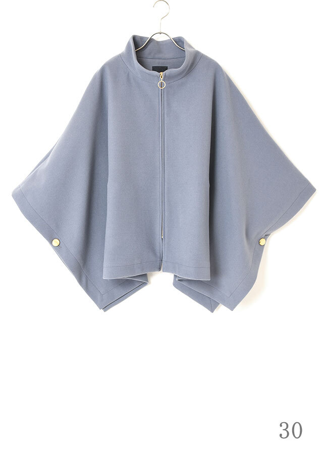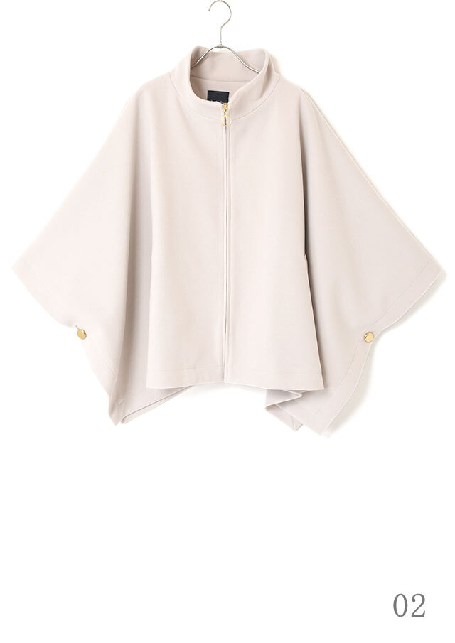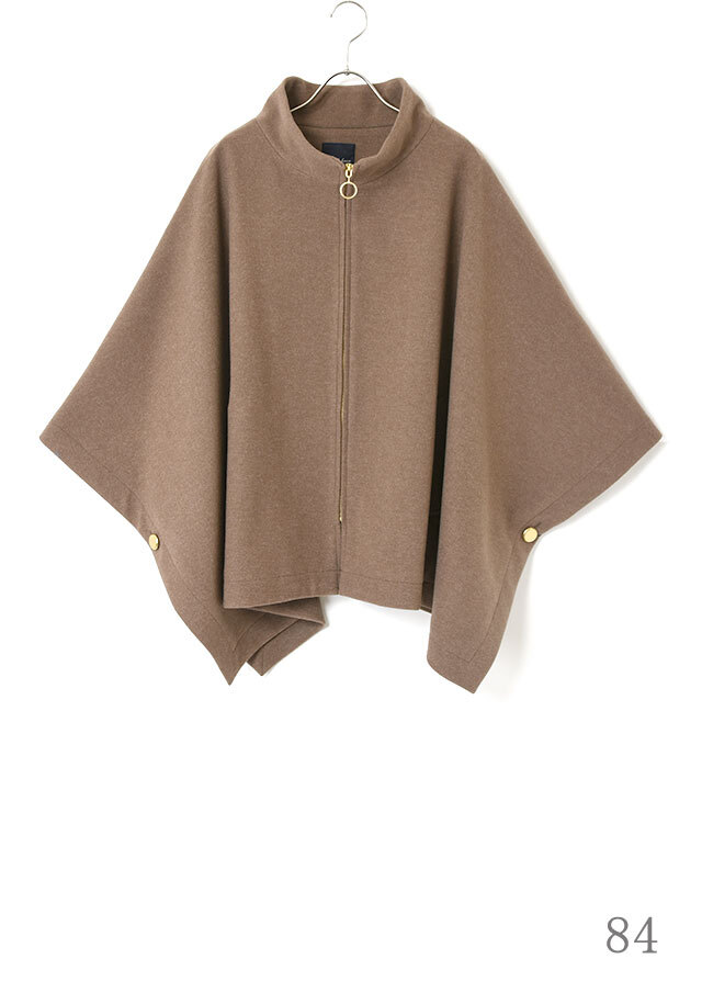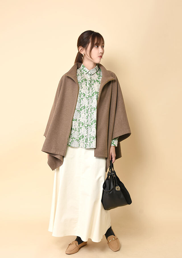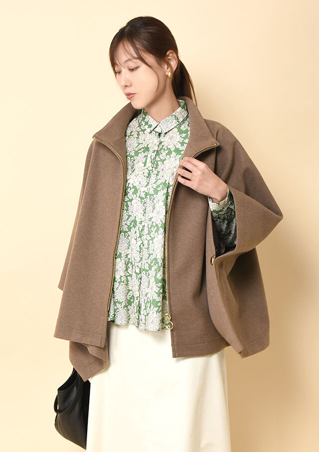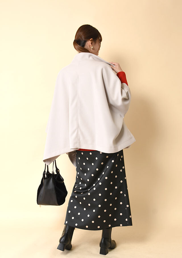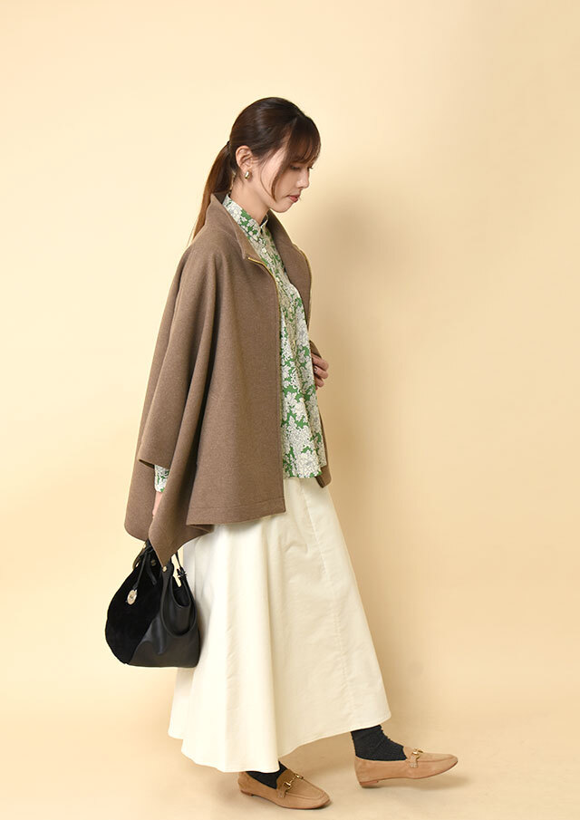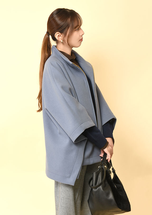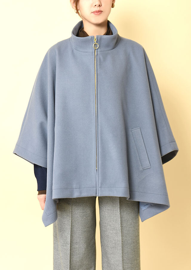 ポンチョらしいゆとりのあるフォルムながら、バランスのとれた丈感で全体がもたつかず、軽やかに見えるデザインです。