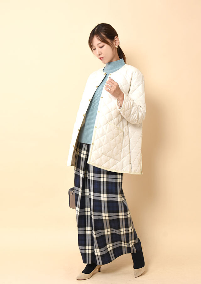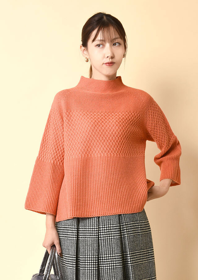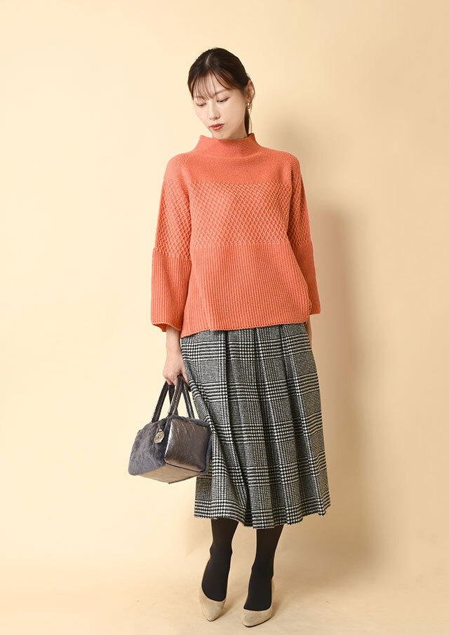 スカートやワイドパンツにインしても、編地の表情がアクセントになり、上品な着こなしに。