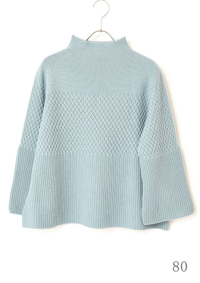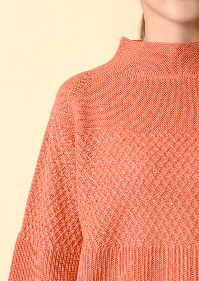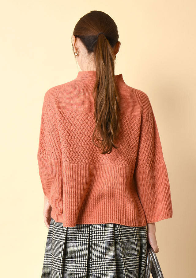 首周りはガーター編みで程よい厚みと立体感を持たせ、モックネックの形を美しくキープ。