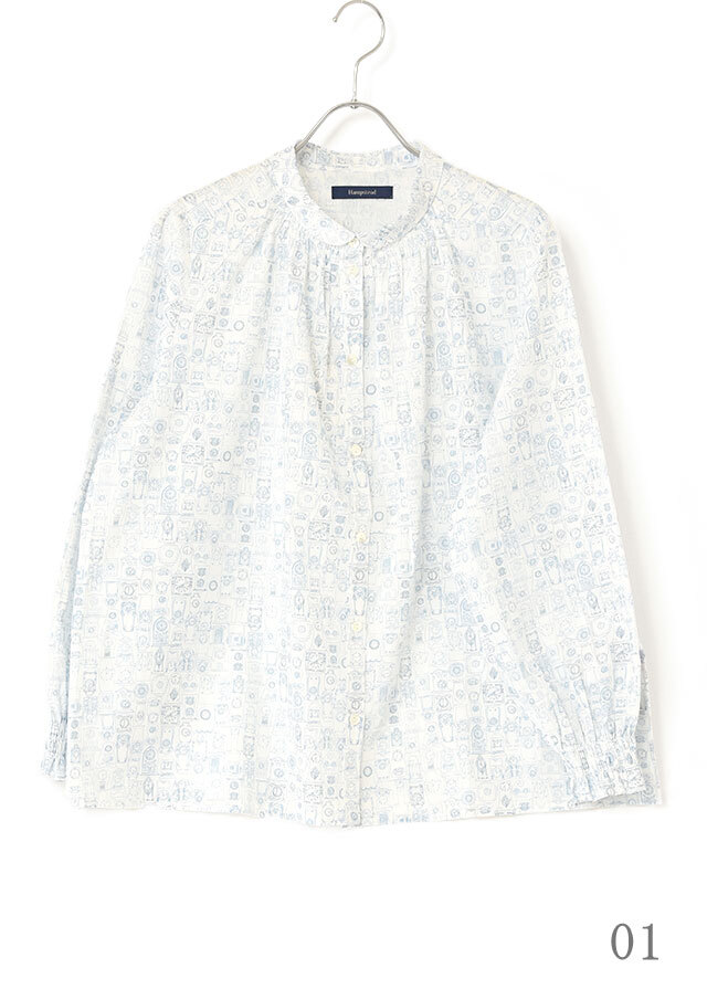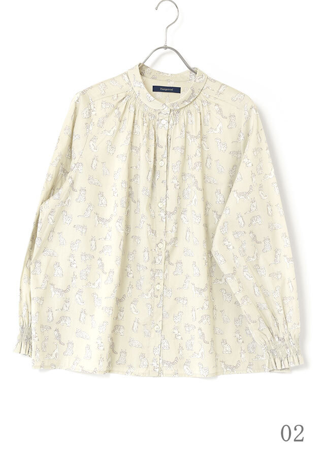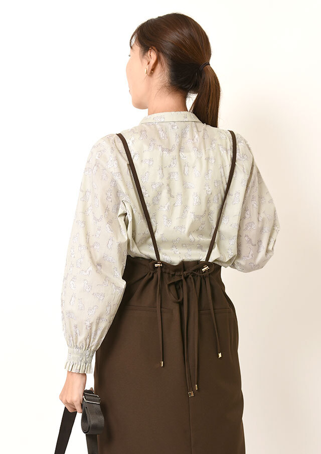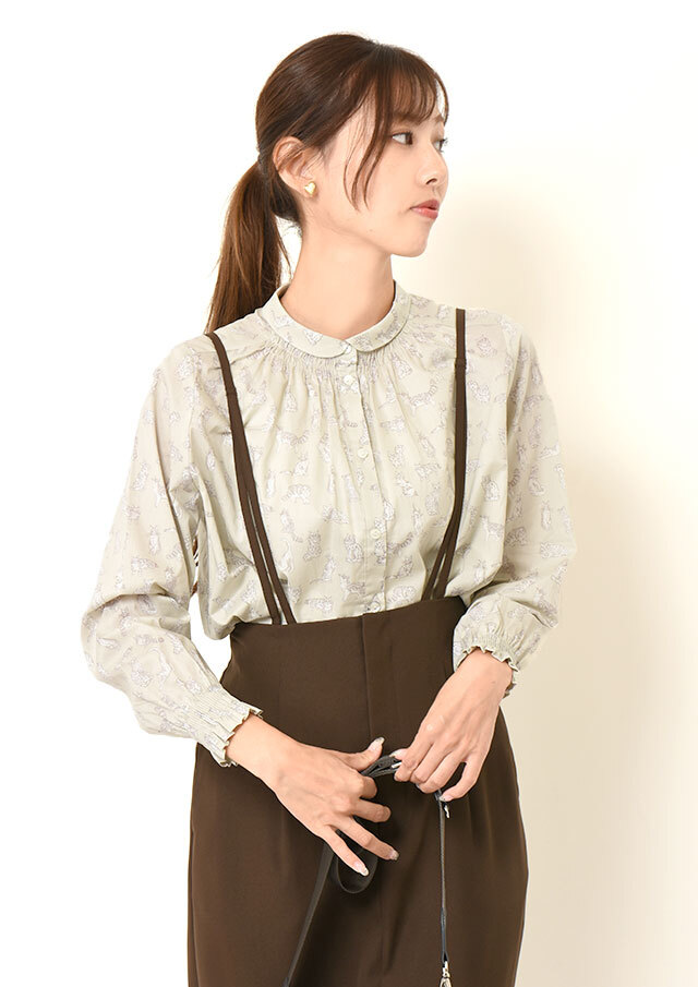 首周りの前側と袖口部分にシャーリングを施し、フェミニンな雰囲気をプラスしたシャツ。