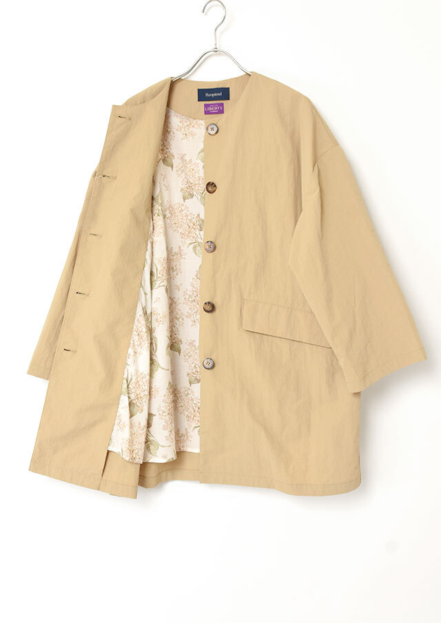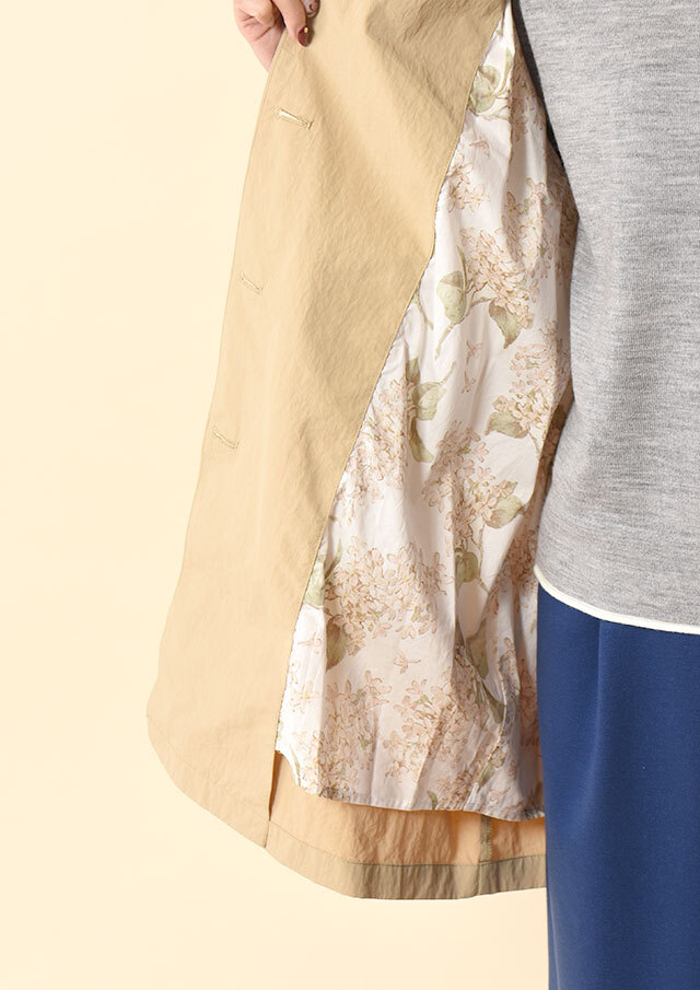 前を開けてラフに羽織れば、裏地のリバティプリントがさりげなく映え、春らしい軽やかさが◎
