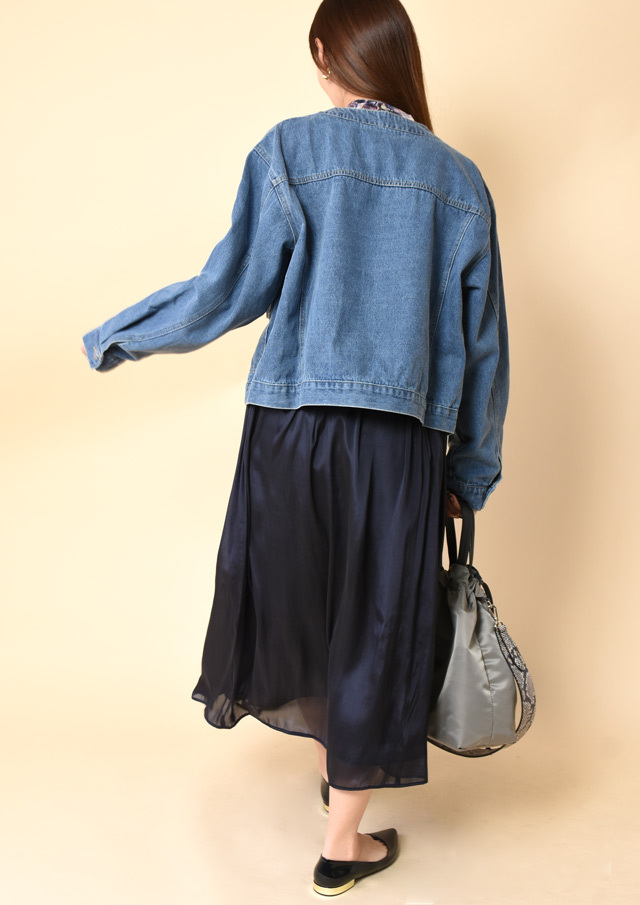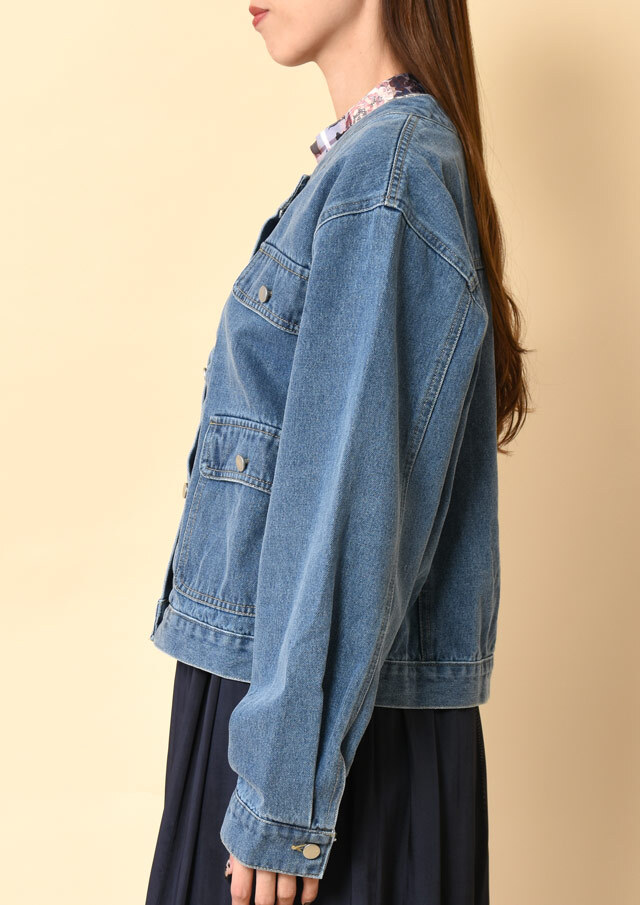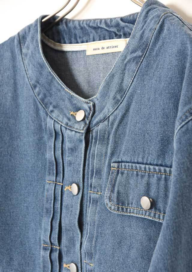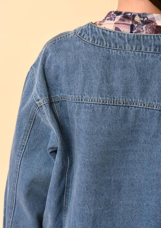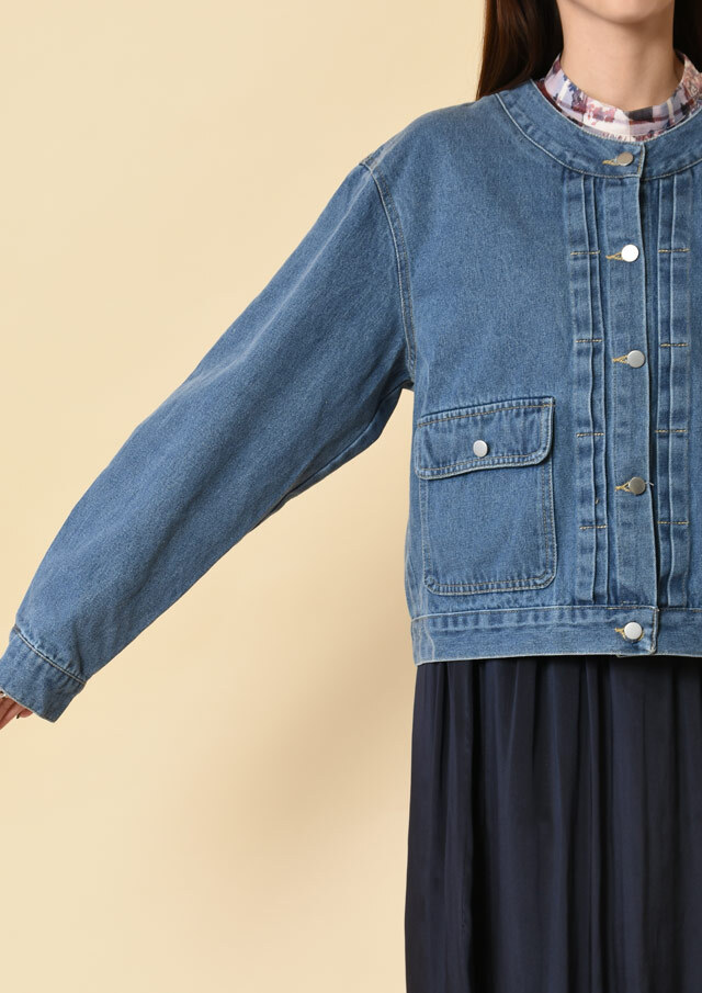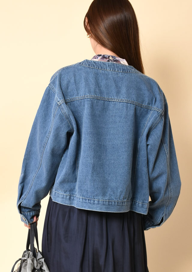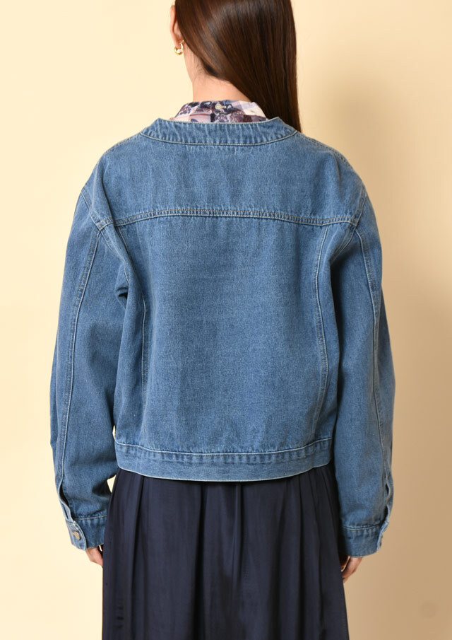 ノーカラーでスッキリとした印象のデニムジャケット。