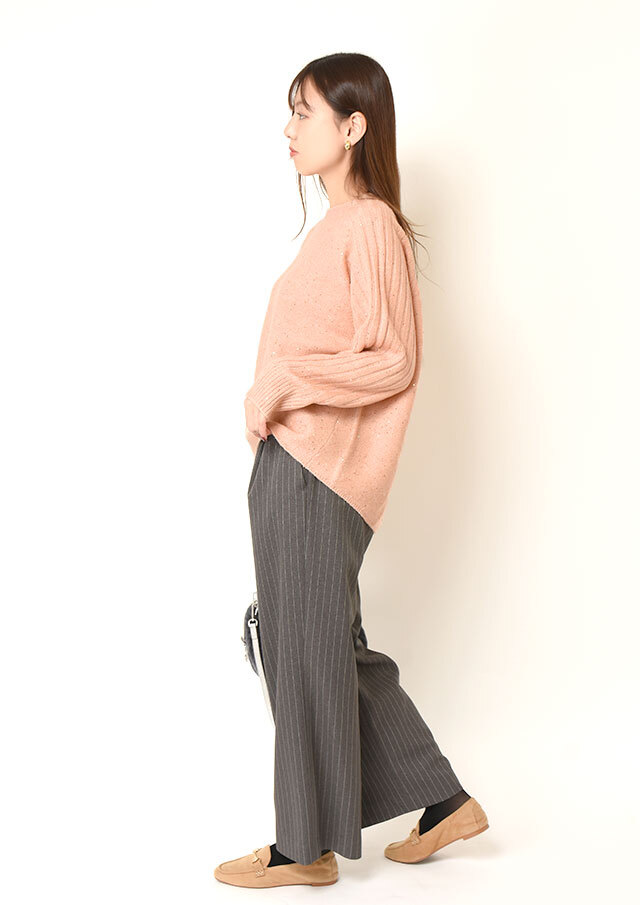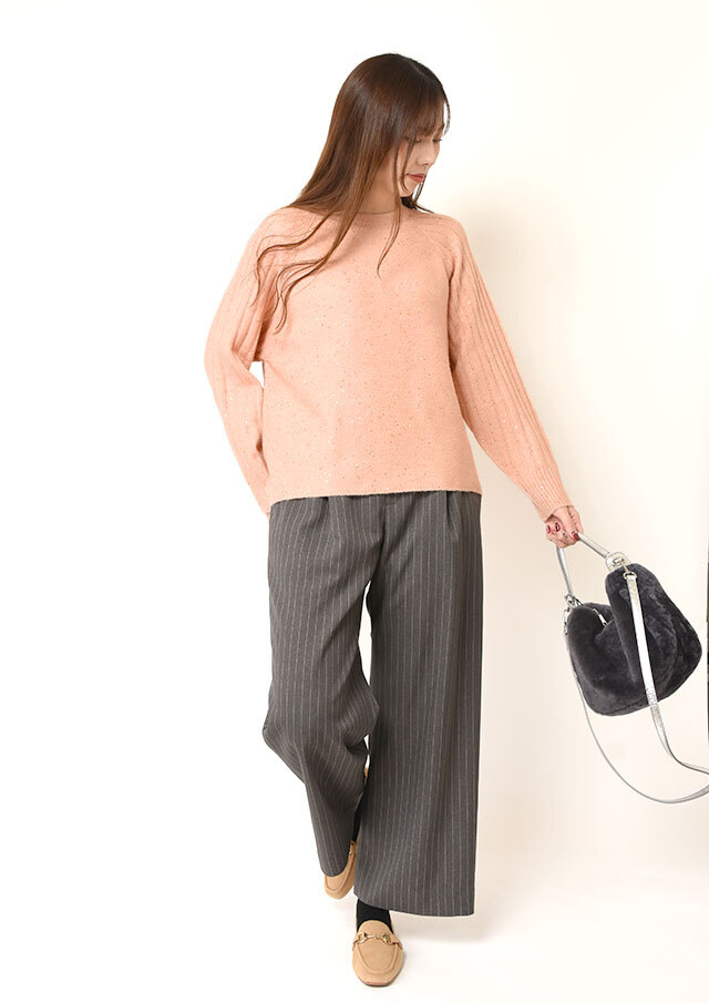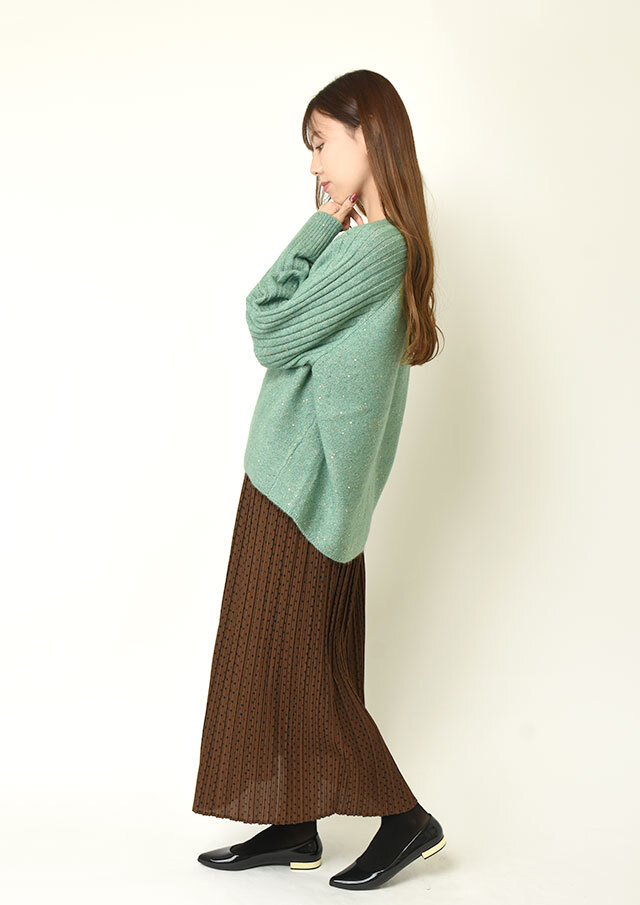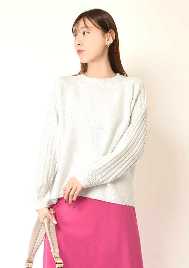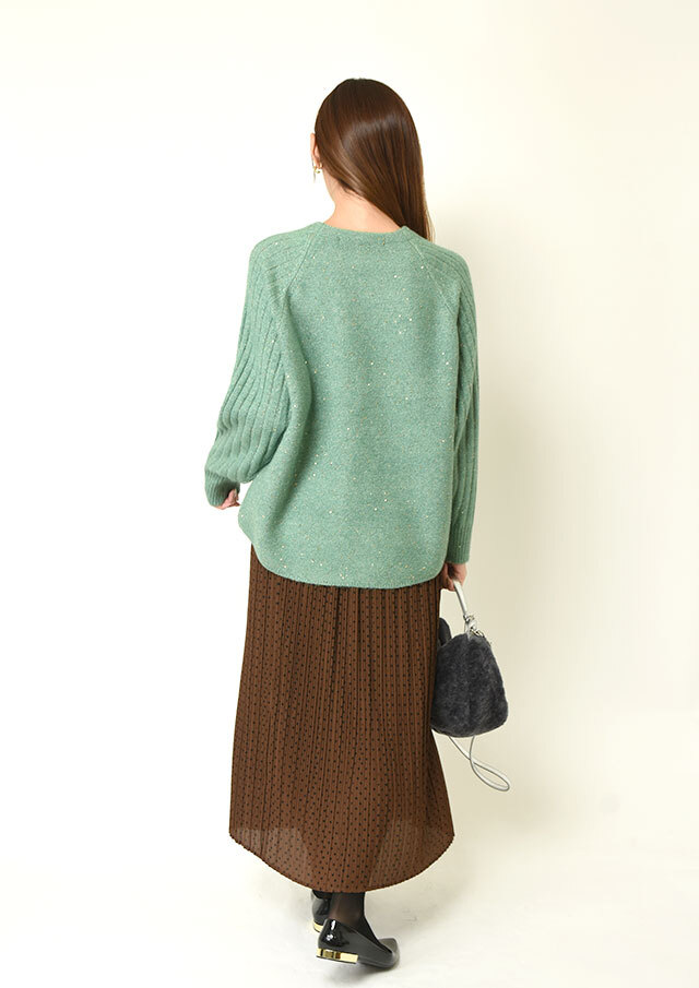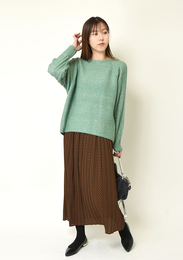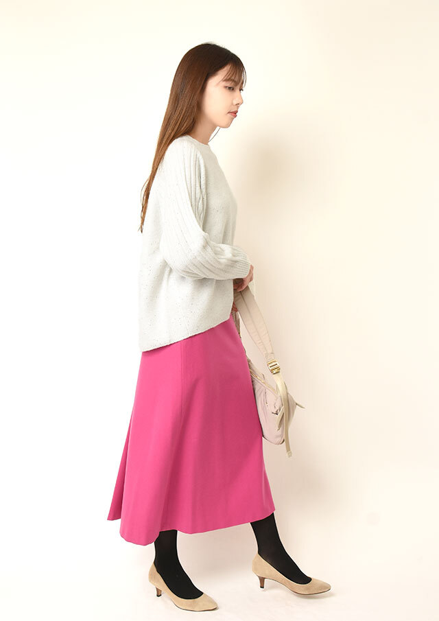 スカートに合わせれば、さりげない光沢とラメ感が上品な華やかさを添え、オフィスにも映える装いに。