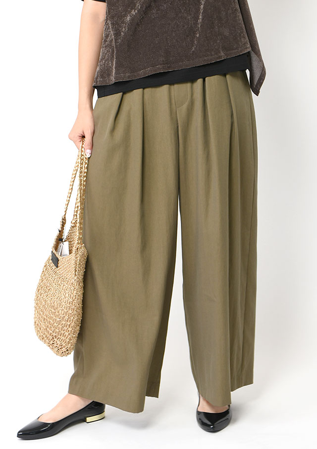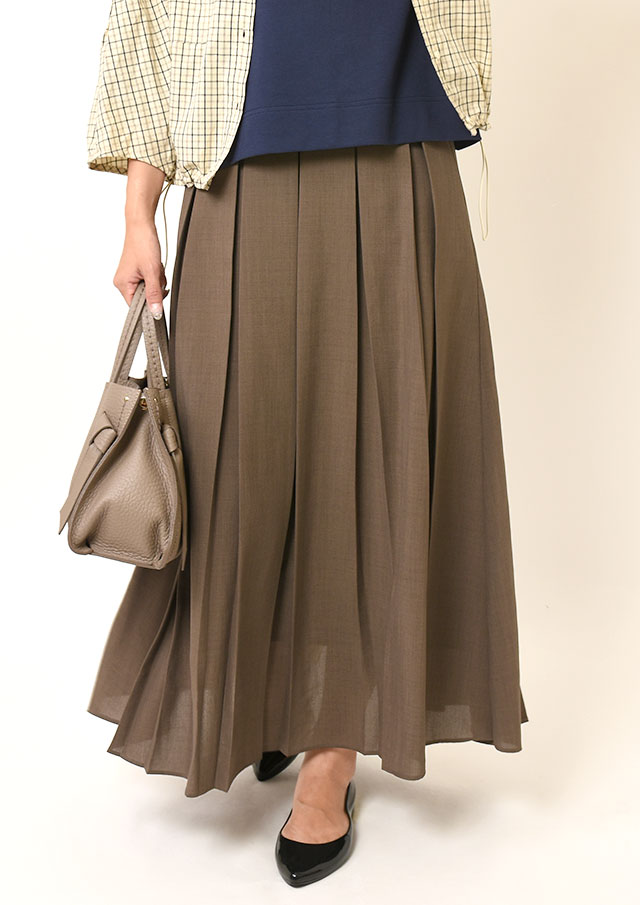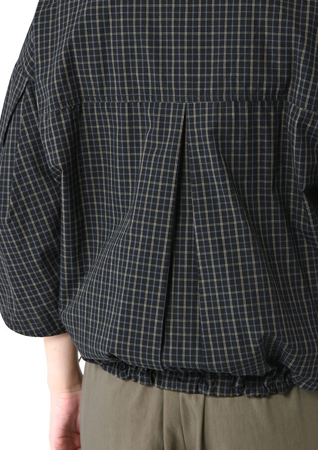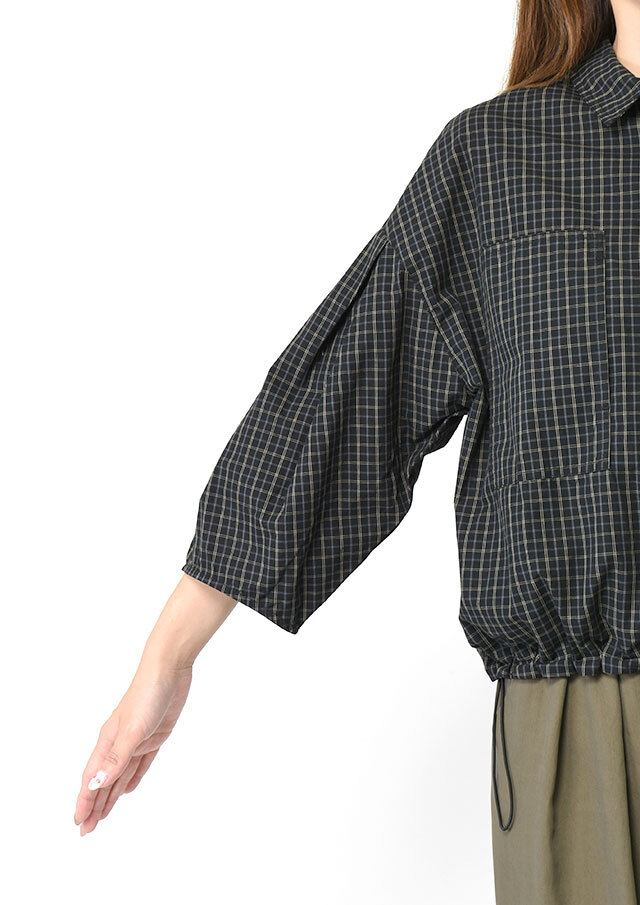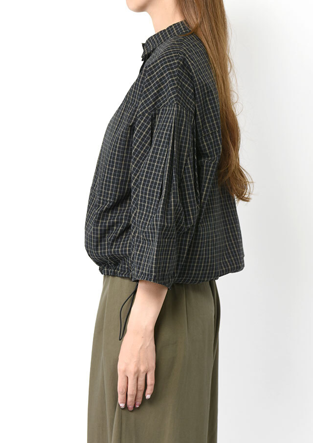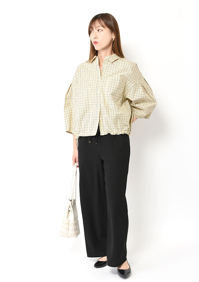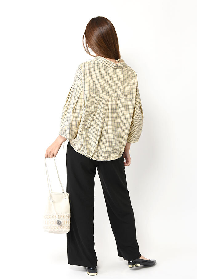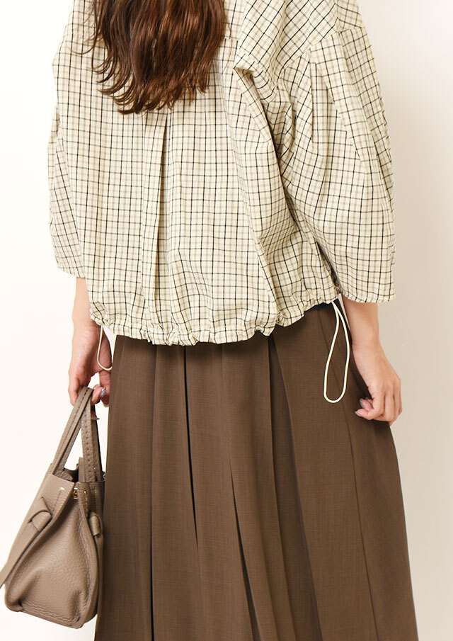 ドロップショルダーとタックスリーブが自然なボリュームを生み、女性らしいやわらかなシルエットを演出します。