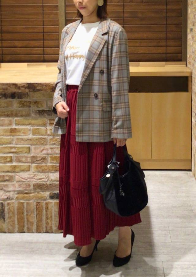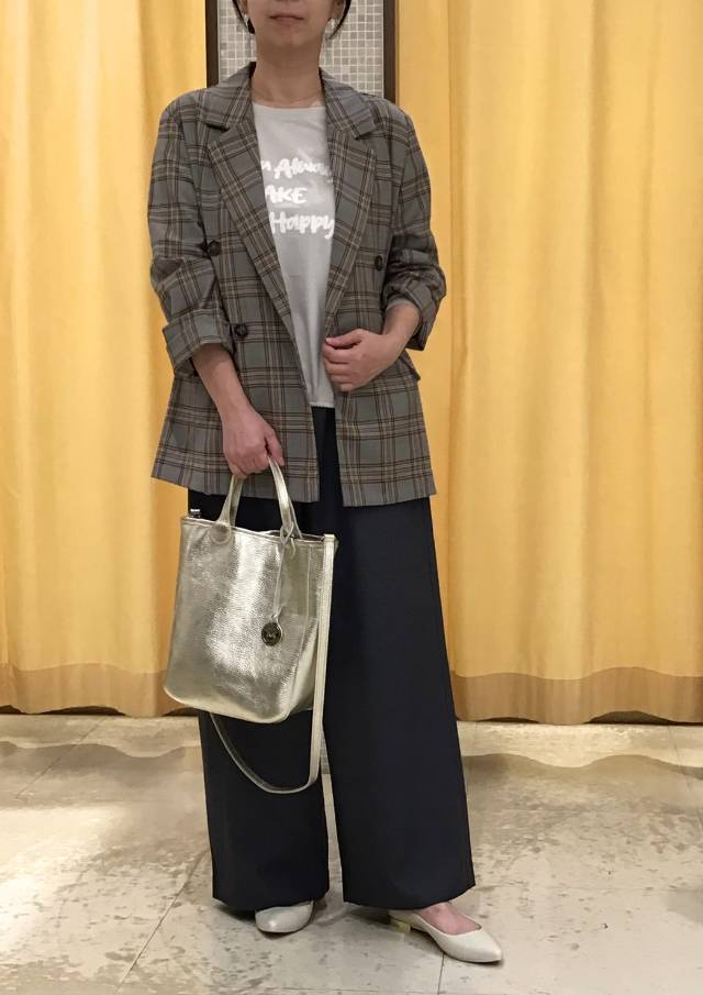 落ち着いた色合いのチェック柄が、主張しすぎずにスタイリングを品良くまとめます。