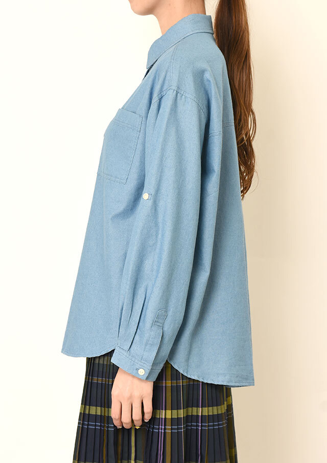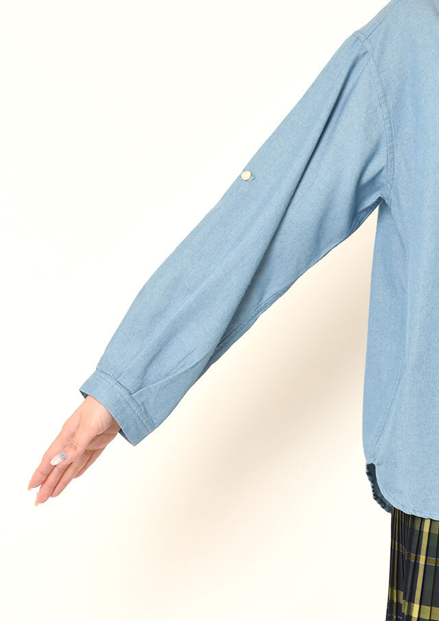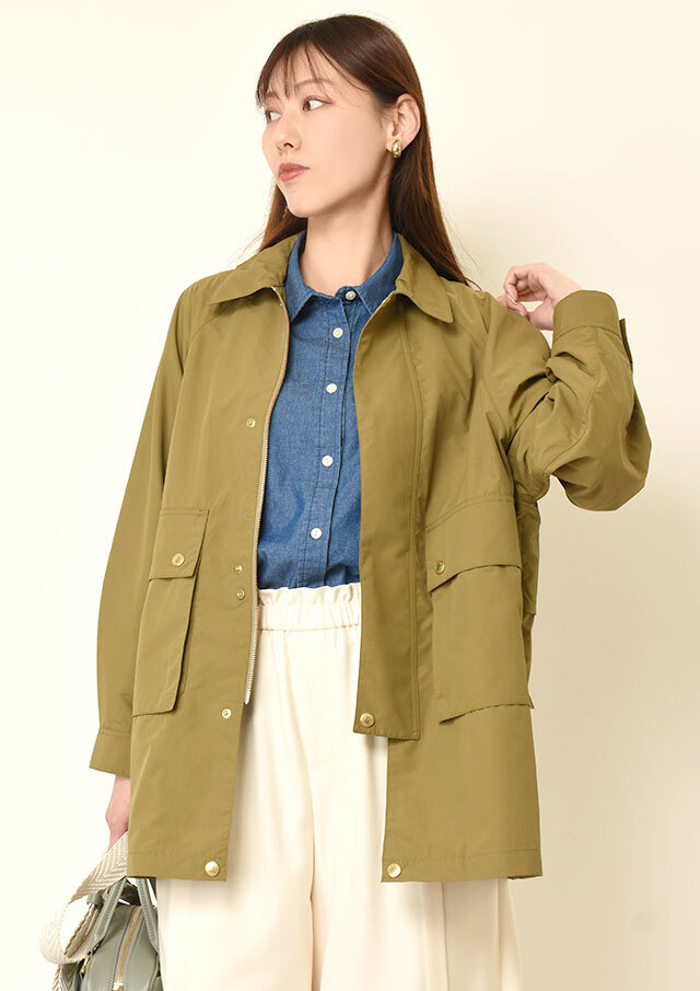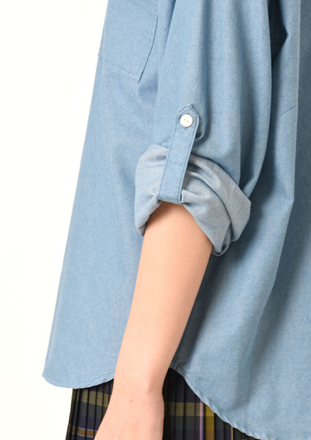 左胸のポケットや袖のロールアップ用ボタンとベルトが、さりげないアクセントになっています。