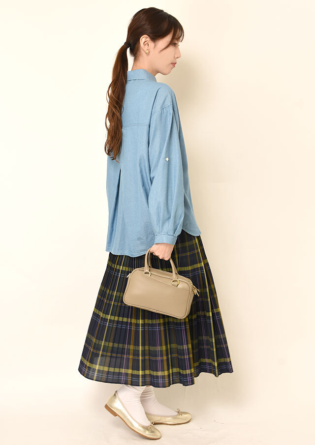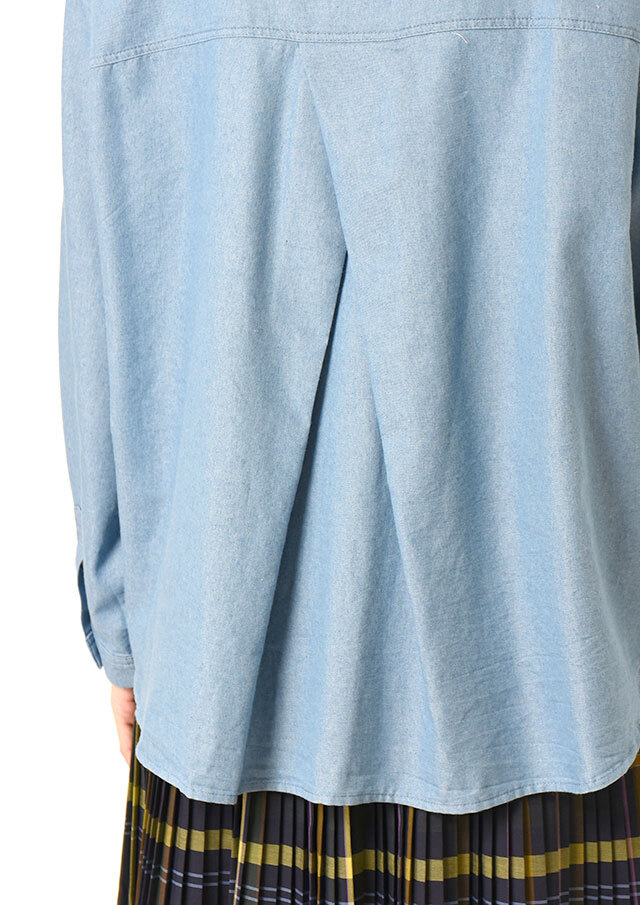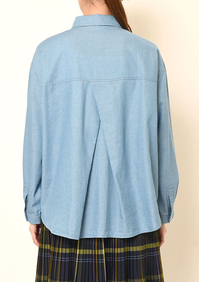 バックヨーク下のフェミニンなタックが斜めに重なり、後ろ姿に奥行きをプラス。
